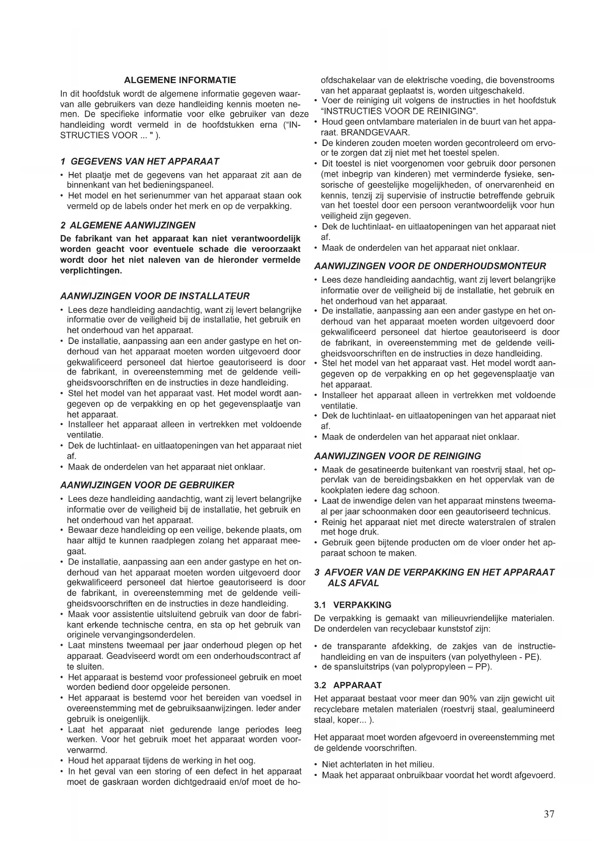 Zie het hoofdstuk “Instructies voor het onderhoud". 16 INBEDRIJFSTELLING Na de installatie, aanpassing aan een ander gastype of on- derhoudswerkzaamheden moet de werking van het apparaat worden gecontroleerd.In het geval van storingen moet de para- graaf “Oplossen van storingen”, verderop in deze handleiding, worden geraadpleegd.