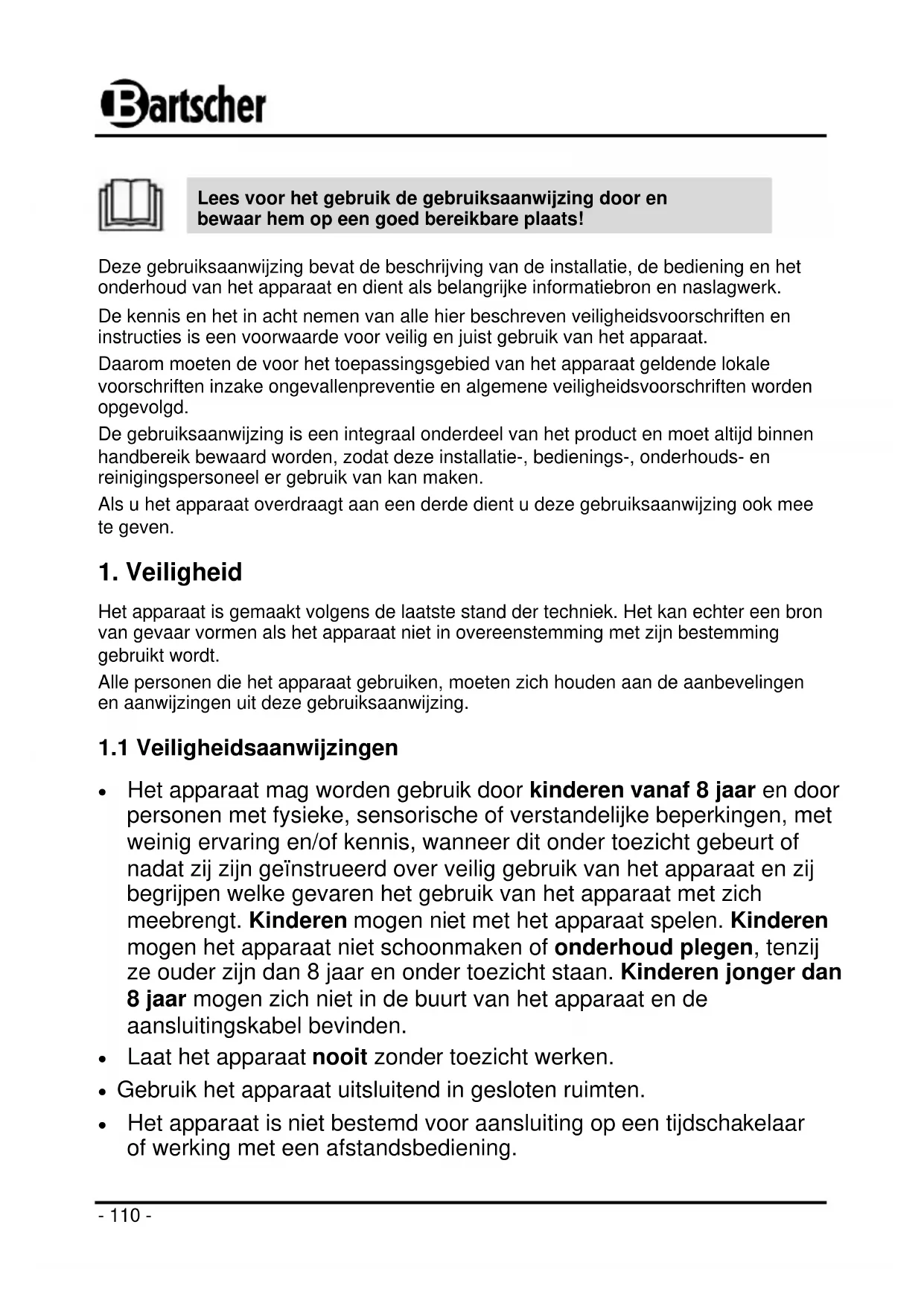 Het apparaat mag worden gebruik door kinderen vanaf 8 jaar en door personen met fysieke, sensorische of verstandelijke beperkingen, met weinig ervaring en/of kennis, wanneer dit onder toezicht gebeurt of nadat zij zijn geïnstrueerd over veilig gebruik van het apparaat en zij begrijpen welke gevaren het gebruik van het apparaat met zich meebrengt. Kinderen mogen niet met het apparaat spelen. Kinderen mogen het apparaat niet schoonmaken of onderhoud plegen, tenzij ze ouder zijn dan 8 jaar en onder toezicht staan. Kinderen jonger dan 8 jaar mogen zich niet in de buurt van het apparaat en de aansluitingskabel bevinden. Laat het apparaat nooit zonder toezicht werken. Gebruik het apparaat uitsluitend in gesloten ruimten. Het apparaat is niet bestemd voor aansluiting op een tijdschakelaar of werking met een afstandsbediening.- 111 -