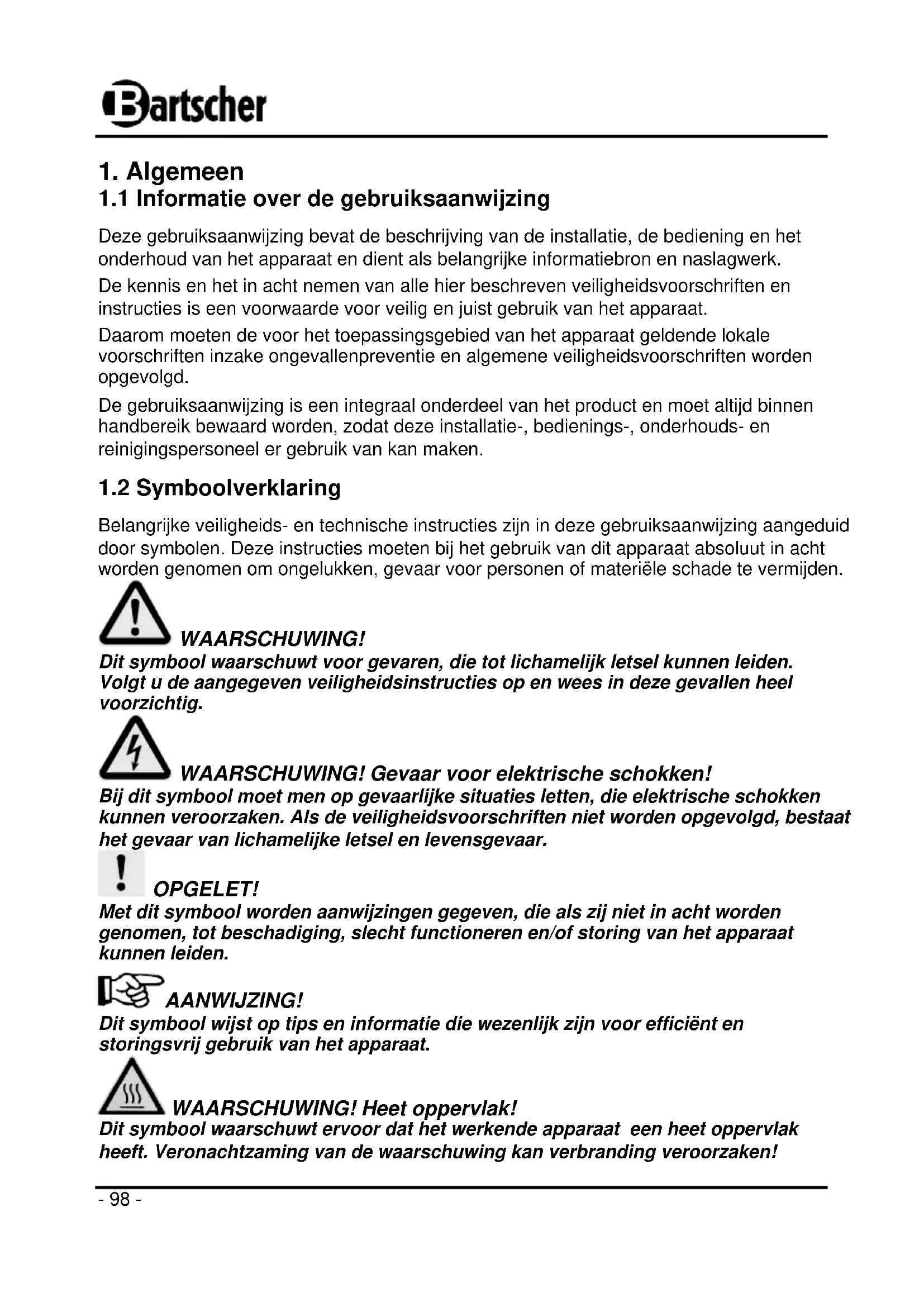 Bartscher GmbH Franz-Kleine-Str. 28 D-33154 Salzkotten Tel.: +49 (0) 5258 971-0 Germany Fax: +49 (0) 5258 971-120 NL/B Lees voor het gebruik de gebruiksaanwijzing door en bewaar hem op een goed bereikbare plaats!- 98 -
