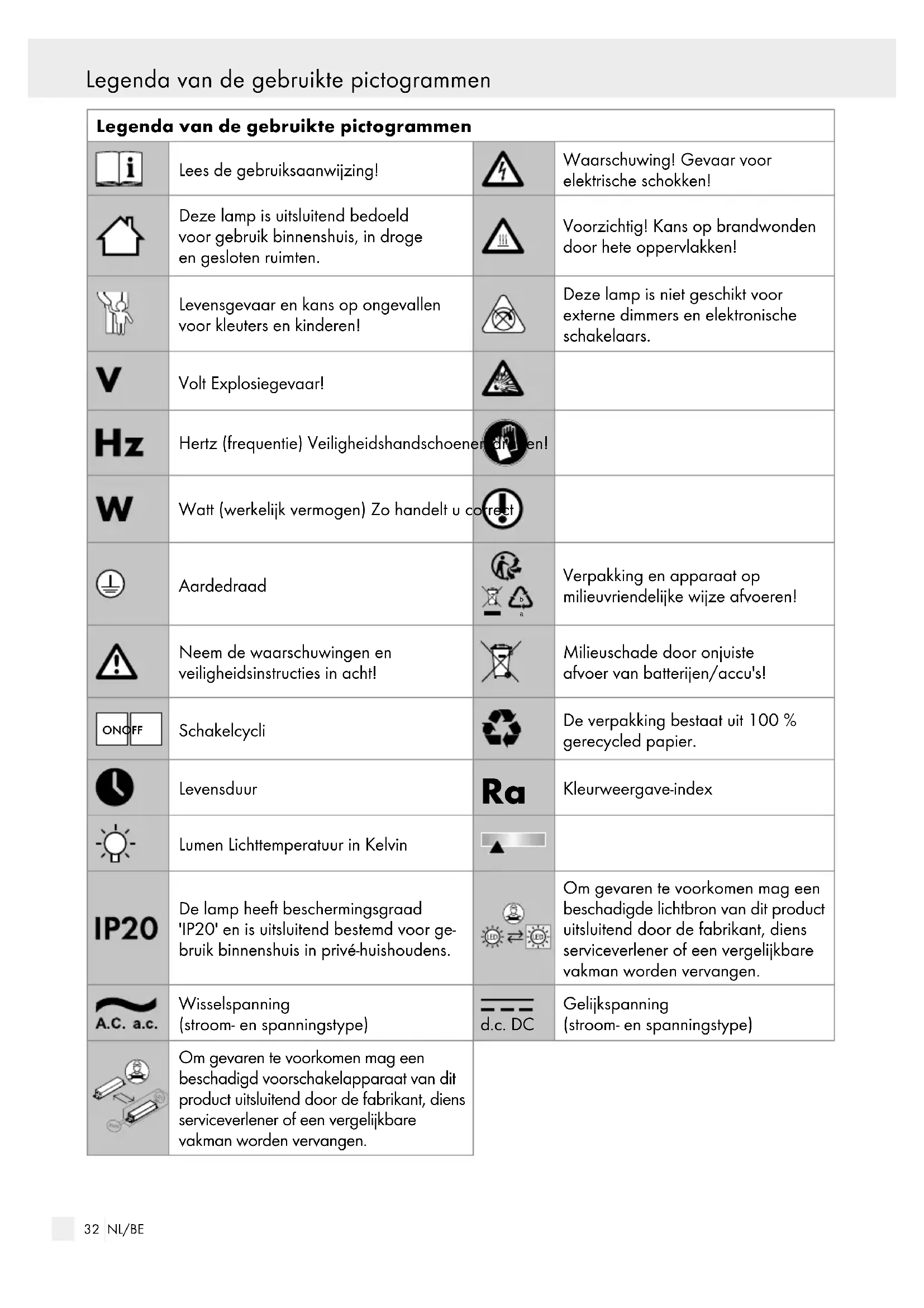 WONDEN DOOR HETE OPPERVLAKKEN! Laat de lamp volledig afkoelen. Gebruik geen oplosmiddelen zoals benzine e.d. De lamp zal hierdoor beschadigd raken. Gebruik voor de reiniging uitsluitend een droge, pluisvrije doek. Plaats de zekering weer terug of schakel de hoofdzekering in de zekeringenkast weer in (I-stand). Afvoer De verpakking bestaat uit milieuvriendelijke grond- stoffen die u via de plaatselijke recyclingcontainers kunt afvoeren.
