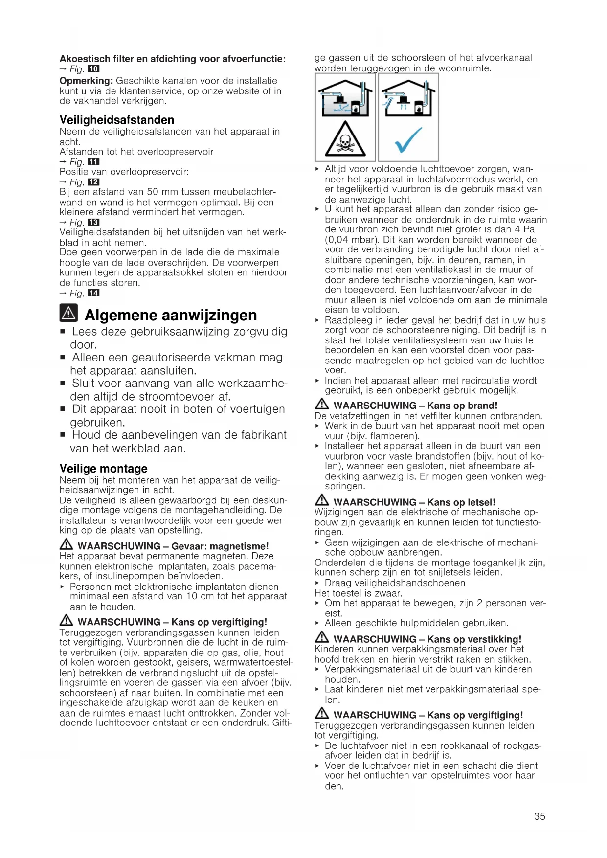 Algemene aanwijzingen ¡ Lees deze gebruiksaanwijzing zorgvuldig door. ¡ Alleen een geautoriseerde vakman mag het apparaat aansluiten. ¡ Sluit voor aanvang van alle werkzaamhe- den altijd de stroomtoevoer af. ¡ Dit apparaat nooit in boten of voertuigen gebruiken. ¡ Houd de aanbevelingen van de fabrikant van het werkblad aan. Veilige montage Neem bij het monteren van het apparaat de veilig- heidsaanwijzingen in acht. De veiligheid is alleen gewaarborgd bij een deskun- dige montage volgens de montagehandleiding. De installateur is verantwoordelijk voor een goede wer- king op de plaats van opstelling. WAARSCHUWING‒Gevaar: magnetisme! Het apparaat bevat permanente magneten. Deze kunnen elektronische implantaten, zoals pacema- kers, of insulinepompen beïnvloeden. ▶ Personen met elektronische implantaten dienen minimaal een afstand van 10 cm tot het apparaat aan te houden. WAARSCHUWING‒Kans op vergiftiging! Teruggezogen verbrandingsgassen kunnen leiden tot vergiftiging. Vuurbronnen die de lucht in de ruim- te verbruiken (bijv. apparaten die op gas, olie, hout of kolen worden gestookt, geisers, warmwatertoestel- len) betrekken de verbrandingslucht uit de opstel- lingsruimte en voeren de gassen via een afvoer (bijv. schoorsteen) af naar buiten. In combinatie met een ingeschakelde afzuigkap wordt aan de keuken en aan de ruimtes ernaast lucht onttrokken. Zonder vol- doende luchttoevoer ontstaat er een onderdruk. Gifti- ge gassen uit de schoorsteen of het afvoerkanaal worden teruggezogen in de woonruimte. ▶ Altijd voor voldoende luchttoevoer zorgen, wan- neer het apparaat in luchtafvoermodus werkt, en er tegelijkertijd vuurbron is die gebruik maakt van de aanwezige lucht. ▶ U kunt het apparaat alleen dan zonder risico ge- bruiken wanneer de onderdruk in de ruimte waarin de vuurbron zich bevindt niet groter is dan 4 Pa (0,04 mbar). Dit kan worden bereikt wanneer de voor de verbranding benodigde lucht door niet af- sluitbare openingen, bijv. in deuren, ramen, in combinatie met een ventilatiekast in de muur of door andere technische voorzieningen, kan wor- den toegevoerd. Een luchtaanvoer/afvoer in de muur alleen is niet voldoende om aan de minimale eisen te voldoen. ▶ Raadpleeg in ieder geval het bedrijf dat in uw huis zorgt voor de schoorsteenreiniging. Dit bedrijf is in staat het totale ventilatiesysteem van uw huis te beoordelen en kan een voorstel doen voor pas- sende maatregelen op het gebied van de luchttoe- voer. ▶ Indien het apparaat alleen met recirculatie wordt gebruikt, is een onbeperkt gebruik mogelijk. WAARSCHUWING‒Kans op brand! De vetafzettingen in het vetfilter kunnen ontbranden. ▶ Werk in de buurt van het apparaat nooit met open vuur (bijv. flamberen). ▶ Installeer het apparaat alleen in de buurt van een vuurbron voor vaste brandstoffen (bijv. hout of ko- len), wanneer een gesloten, niet afneembare af- dekking aanwezig is. Er mogen geen vonken weg- springen. WAARSCHUWING‒Kans op letsel! Wijzigingen aan de elektrische of mechanische op- bouw zijn gevaarlijk en kunnen leiden tot functiesto- ringen. ▶ Geen wijzigingen aan de elektrische of mechani- sche opbouw aanbrengen. Onderdelen die tijdens de montage toegankelijk zijn, kunnen scherp zijn en tot snijletsels leiden. ▶ Draag veiligheidshandschoenen Het toestel is zwaar. ▶ Om het apparaat te bewegen, zijn 2 personen ver- eist. ▶ Alleen geschikte hulpmiddelen gebruiken. WAARSCHUWING‒Kans op verstikking! Kinderen kunnen verpakkingsmateriaal over het hoofd trekken en hierin verstrikt raken en stikken. ▶ Verpakkingsmateriaal uit de buurt van kinderen houden. ▶ Laat kinderen niet met verpakkingsmateriaal spe- len. WAARSCHUWING‒Kans op vergiftiging! Teruggezogen verbrandingsgassen kunnen leiden tot vergiftiging. ▶ De luchtafvoer niet in een rookkanaal of rookgas- afvoer leiden dat in bedrijf is. ▶ Voer de luchtafvoer niet in een schacht die dient voor het ontluchten van opstelruimtes voor haar- den.36 ▶ Moet de luchtafvoer in een rook- of afvoergas- schoorsteen worden geleid die niet in gebruik is, dan dient hiervoor toestemming van een vakbe- kwame schoorsteenveger te worden verkregen. Teruggezogen verbrandingsgassen kunnen leiden tot vergiftiging. ▶ Wanneer een afzuigkap wordt geïnstalleerd met een haard die afhankelijk is van de ruimtelucht, dan moet de stroomtoevoer van de afzuigkap zijn voorzien van een geschikte veiligheidsschakeling. Aanwijzingen voor de elektrische aansluiting Om het apparaat elektrisch veilig te kunnen aanslui- ten, dient u deze aanwijzingen in acht te nemen. WAARSCHUWING‒Kans op elektrische schok! Het apparaat moet op elk gewenst moment van de stroom kunnen worden afgesloten. Het apparaat mag alleen op een geaard stopcontact worden aan- gesloten die volgens de voorschriften is geïnstal- leerd. ▶ In de vast geplaatste elektrische installatie moet een alpolige scheidingsinrichting volgens de voor- waarden van de overspanningscategorie III en vol- gens de opbouwvoorschriften worden ingebouwd. ▶ De vaste aansluiting mag alleen door een elektri- cien worden aangelegd. Wij adviseren een aard- lekschakelaar (FI-schakelaar) in de stroomkring naar het apparaat te installeren. ¡ De aansluitkabel niet knikken of inklemmen en uit de buurt van scherpe randen houden. ¡ De aansluitkabel zodanig plaatsen dat deze de he- te behuizing van het apparaat niet raakt. ¡ Alleen de bij het apparaat meegeleverde of door de technische servicedienst geleverde aansluitka- bel gebruiken. ¡ Dit apparaat voldoet aan de ontstoringsvoorschrif- ten van de EG. ¡ Het apparaat is conform de beschermingsklasse