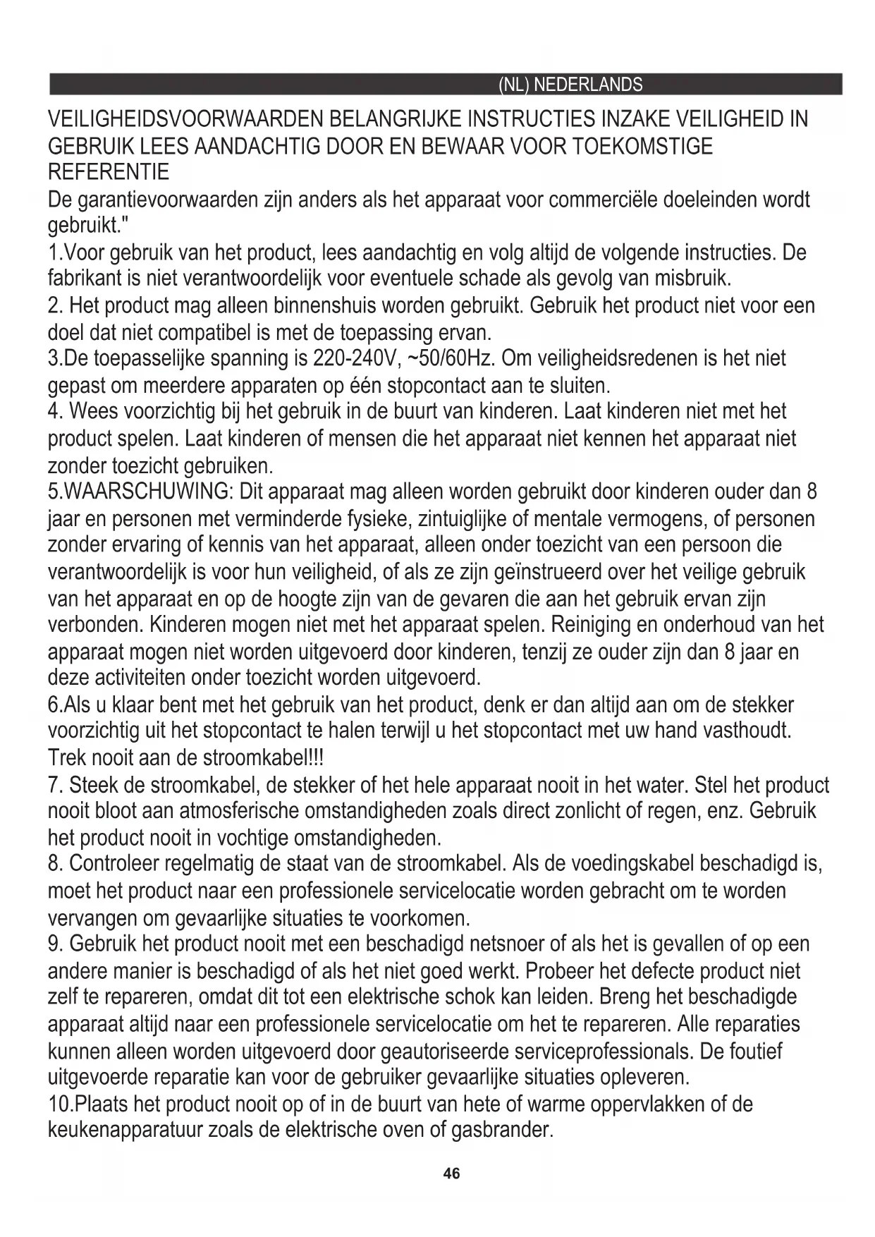nooit bloot aan atmosferische omstandigheden zoals direct zonlicht of regen, enz. Gebruik het product nooit in vochtige omstandigheden. 1.Voor gebruik van het product, lees aandachtig en volg altijd de volgende instructies. De fabrikant is niet verantwoordelijk voor eventuele schade als gevolg van misbruik. 10.Plaats het product nooit op of in de buurt van hete of warme oppervlakken of de keukenapparatuur zoals de elektrische oven of gasbrander. 3.De toepasselijke spanning is 220-240V, ~50/60Hz. Om veiligheidsredenen is het niet gepast om meerdere apparaten op één stopcontact aan te sluiten. 6.Als u klaar bent met het gebruik van het product, denk er dan altijd aan om de stekker voorzichtig uit het stopcontact te halen terwijl u het stopcontact met uw hand vasthoudt. Trek nooit aan de stroomkabel!!!