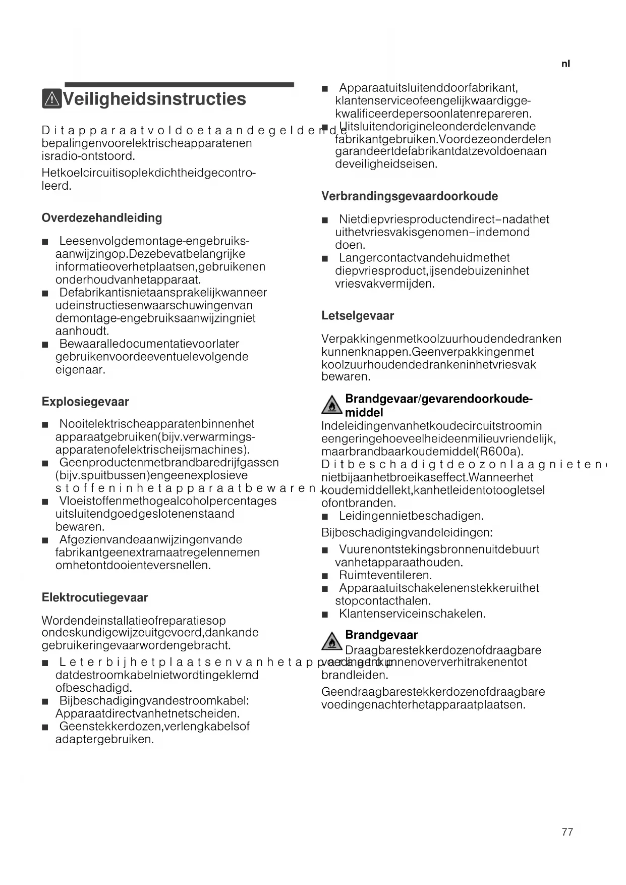 ( Veiligheidsinstructies Ditapparaatvoldoetaandegeldende bepalingen voor elektrische apparaten en is radio-ontstoord. Het koelcircuit is op lekdichtheid gecontro leerd. Over deze handleiding Ø Lees en volg de montage- en gebruiks aanwijzing op. Deze bevat belangrijke informatie over het plaatsen, gebruiken en onderhoud van het apparaat. Ø De fabrikant is niet aansprakelijk wanneer u de instructies en waarschuwingen van de montage- en gebruiksaanwijzing niet aanhoudt. Ø Bewaar alle documentatie voor later gebruik en voor de eventuele volgende eigenaar. Explosiegevaar Ø Nooit elektrische apparaten binnen het apparaat gebruiken (bijv. verwarmings apparaten of elektrische ijsmachines). Ø Geen producten met brandbare drijfgassen (bijv. spuitbussen) en geen explosieve stoffeninhetapparaatbewaren. Ø Vloeistoffen met hoge alcoholpercentages uitsluitend goed gesloten en staand bewaren. Ø Afgezien van de aanwijzingen van de fabrikant geen extra maatregelen nemen om het ontdooien te versnellen. Elektrocutiegevaar Worden de installatie of reparaties op ondeskundige wijze uitgevoerd, dan kan de gebruiker in gevaar worden gebracht. Ø Leterbijhetplaatsenvanhetapparaatop dat de stroomkabel niet wordt ingeklemd of beschadigd. Ø Bij beschadiging van de stroomkabel: Apparaat direct van het net scheiden. Ø Geen stekkerdozen, verlengkabels of adapter gebruiken. Ø Apparaat uitsluitend d oor fabrikant, klantenservice of een gelijkwaardig ge kwalificeerde persoon laten repareren. Ø Uitsluitend originele onderdelen van de fabrikant gebruiken. Voor deze onderdelen garandeert de fabrikant dat ze voldoen aan de veiligheidseisen. Verbrandingsgevaar door koude Ø Niet diepvriesproducten direct – nadat het uit het vriesvak is genomen – in de mond doen. Ø Langer contact van de huid met het diepvriesproduct, ijs en de buizen in het vriesvak vermijden. Letselgevaar Verpakkingen met koolzuurhoudende dranken kunnen knappen. Geen verpakkingen met koolzuurhoudende dranken in het vriesvak bewaren. Brandgevaar / gevaren door koude middel In de leidingen van het koudecircuit stroom in een geringe hoeveelheid een milieuvriendelijk, maar brandbaar koudemiddel (R600a). Ditbeschadigtdeozonlaagnietendraagt niet bij aan het broeikaseffect. Wanneer het koudemiddel lekt, kan het leiden tot oogletsel of ontbranden. Ø Leidingen niet beschadigen. Bij beschadiging van de leidingen: Ø Vuur en ontstekingsbronnen uit de buurt van het apparaat houden. Ø Ruimte ventil eren. Ø Apparaat uitschakelen en stekker uit het stopcontact halen. Ø Klantenservice inschakelen. Brandgevaar Draagbare stekkerdozen of draagbare voedingen kunnen oververhit raken en tot brand leiden. Geen draagbare stekkerdozen of draagbare voedingen achter het apparaat plaatsen.nl