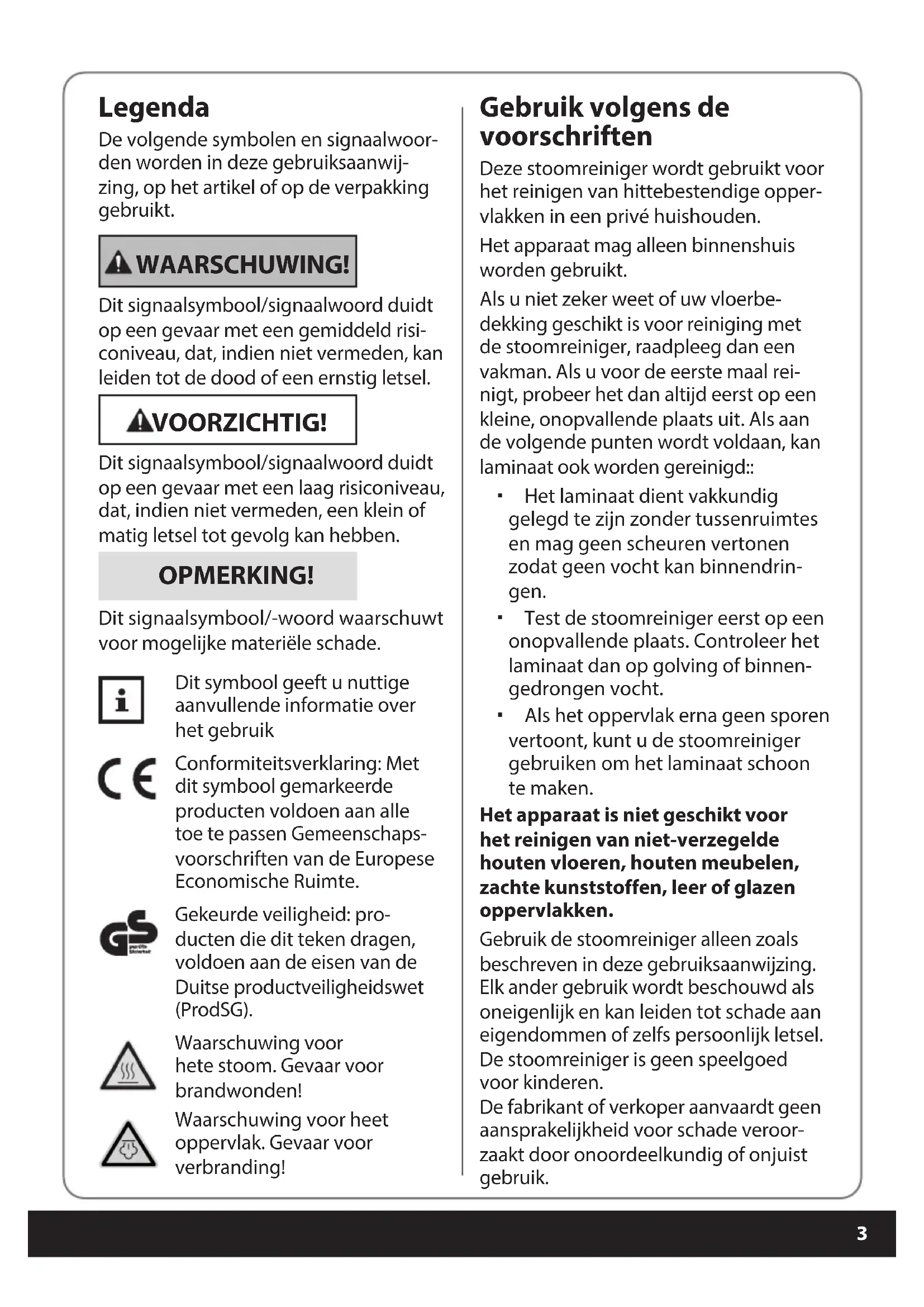 Legenda De volgende symbolen en signaalwoor- den worden in deze gebruiksaanwij- zing, op het artikel of op de verpakking gebruikt. WAARSCHUWING! Dit signaalsymbool/signaalwoord duidt op een gevaar met een gemiddeld risi- coniveau, dat, indien niet vermeden, kan leiden tot de dood of een ernstig letsel. VOORZICHTIG! Dit signaalsymbool/signaalwoord duidt op een gevaar met een laag risiconiveau, dat, indien niet vermeden, een klein of matig letsel tot gevolg kan hebben. OPMERKING! Dit signaalsymbool/-woord waarschuwt voor mogelijke materiële schade. Dit symbool geeft u nuttige aanvullende informatie over het gebruik Conformiteitsverklaring: Met dit symbool gemarkeerde producten voldoen aan alle toe te passen Gemeenschaps- voorschriften van de Europese Economische Ruimte. Gekeurde veiligheid: pro- ducten die dit teken dragen, voldoen aan de eisen van de Duitse productveiligheidswet (ProdSG). Waarschuwing voor hete stoom. Gevaar voor brandwonden! Waarschuwing voor heet oppervlak. Gevaar voor verbranding! Gebruik volgens de voorschriften Deze stoomreiniger wordt gebruikt voor het reinigen van hittebestendige opper- vlakken in een privé huishouden. Het apparaat mag alleen binnenshuis worden gebruikt. Als u niet zeker weet of uw vloerbe- dekking geschikt is voor reiniging met de stoomreiniger, raadpleeg dan een vakman. Als u voor de eerste maal rei- nigt, probeer het dan altijd eerst op een kleine, onopvallende plaats uit. Als aan de volgende punten wordt voldaan, kan laminaat ook worden gereinigd:: Het laminaat dient vakkundig gelegd te zijn zonder tussenruimtes en mag geen scheuren vertonen zodat geen vocht kan binnendrin- gen. Test de stoomreiniger eerst op een onopvallende plaats. Controleer het laminaat dan op golving of binnen- gedrongen vocht. Als het oppervlak erna geen sporen vertoont, kunt u de stoomreiniger gebruiken om het laminaat schoon te maken. Het apparaat is niet geschikt voor het reinigen van niet-verzegelde houten vloeren, houten meubelen, zachte kunststoffen, leer of glazen oppervlakken. Gebruik de stoomreiniger alleen zoals beschreven in deze gebruiksaanwijzing. Elk ander gebruik wordt beschouwd als oneigenlijk en kan leiden tot schade aan eigendommen of zelfs persoonlijk letsel. De stoomreiniger is geen speelgoed voor kinderen. De fabrikant of verkoper aanvaardt geen aansprakelijkheid voor schade veroor- zaakt door onoordeelkundig of onjuist gebruik. Druckbuch Dampfbesen BEL.indb 3Druckbuch Dampfbesen BEL.indb 3 22.11.2021 08:22:0022.11.2021 08:22:004 Veiligheidsvoorschriften WAARSCHUWING! Gevaar voor een elektrische schok! Een verkeerde elektrische installatie of een te hoge netspanning kan leiden tot een elektrische schok. Om stoom te genereren wordt de tank van het apparaat met water gevuld. Dompel het apparaat zelf, het netsnoer en de netstekker echter nooit onder in water of een andere vloeistof want dan bestaat er gevaar voor elektrische schokken. Gebruik het apparaat niet in een vochtige omgeving of een omge- ving met een hoge luchtvochtig- heidsgraad. Sluit het apparaat aan op een goed geïnstalleerd stopcontact waarvan de spanning overeenkomt met de “Technische specicaties”. Zorg ervoor dat het stopcontact gemakkelijk bereikbaar is zodat u indien nodig snel de stekker uit het stopcontact kunt trekken. Gebruik de stoomreiniger niet als het apparaat, het netsnoer of de netstekker beschadigd zijn of als het apparaat gevallen is, als er duidelijke beschadigingen zichtbaar zijn of als het apparaat lekt. Let erop dat het netsnoer niet door scherpe randen of hete voorwerpen wordt beschadigd. Bedien de stoomreiniger niet met natte handen. Richt de stoomstraal niet op elektrische apparaten (televisies, ovens, enz.) of elektrische installaties (schakelaars, stopcontac- ten, enz.). Trek de netstekker uit het stopcon- tact wanneer u de stoomreiniger niet gebruikt, vóór het reinigen, verplaatsen of opbergen van het apparaat en bij duidelijke storingen tijdens het gebruik of tijdens een onweer. Trek daarbij steeds aan de netstekker, niet aan het snoer. Wikkel het netsnoer niet om de stoomreiniger. Gebruik geen verlengsnoer. Wijzig niets aan het apparaat of aan het netsnoer. Laat reparaties alleen door een gespecialiseerde werk- plaats uitvoeren. Houd u ook aan de bijgevoegde garantievoorwaarden. Als de stoomreiniger, het netsnoer of de stekker beschadigd zijn, dient u deze door de fabrikant of een gespecialiseerde werkplaats te laten repareren om gevaren te voorko- men. Gebruik dit apparaat niet in de buurt van badkuipen, zwembaden, douchebakken of andere bakken die water bevatten. Gevaar voor een elektrische schok! WAARSCHUWING! Risico’s voor kinderen en personen met verminderde lichamelijke, zin- tuiglijke of geestelijke capaciteiten (bijvoorbeeld gedeeltelijk gehandi- capte personen, oudere personen met een beperking van hun lichame- lijke en geestelijke capaciteiten) of een gebrek aan ervaring en kennis (bijvoorbeeld oudere kinderen). Dit apparaat kan door personen met verminderde lichamelijke, zintuig- lijke of verstandelijke vermogens of een gebrek aan ervaring en ken- nis worden gebruikt als zij onder Druckbuch Dampfbesen BEL.indb 4Druckbuch Dampfbesen BEL.indb 4 22.11.2021 08:22:0022.11.2021 08:22:005 toezicht staan of als ze zijn opgeleid met betrekking tot het veilig gebruik van het apparaat en de daaruit voortvloeiende gevaren hebben begrepen. Houd het apparaat uit de buurt van kinderen, als het ingeschakeld is of afkoelt. Kinderen mogen niet met het appa- raat spelen. Houd kinderen uit de buurt van verpakkingsmateriaal. Er bestaat verstikkingsgevaar als verpakkings- materiaal en kleine onderdelen worden ingeslikt. Let er ook op dat de zak van de verpakking niet over het hoofd wordt getrokken. WAARSCHUWING! Gevaar voor brand, brandwonden en verbranding! Tijdens het gebruik is de ontsnappende stoom zeer heet. De uittredende stoom is erg heet. Vermijd het om ermee in contact te komen Richt de hete stoom nooit op mensen of dieren. Laat het apparaat niet zonder