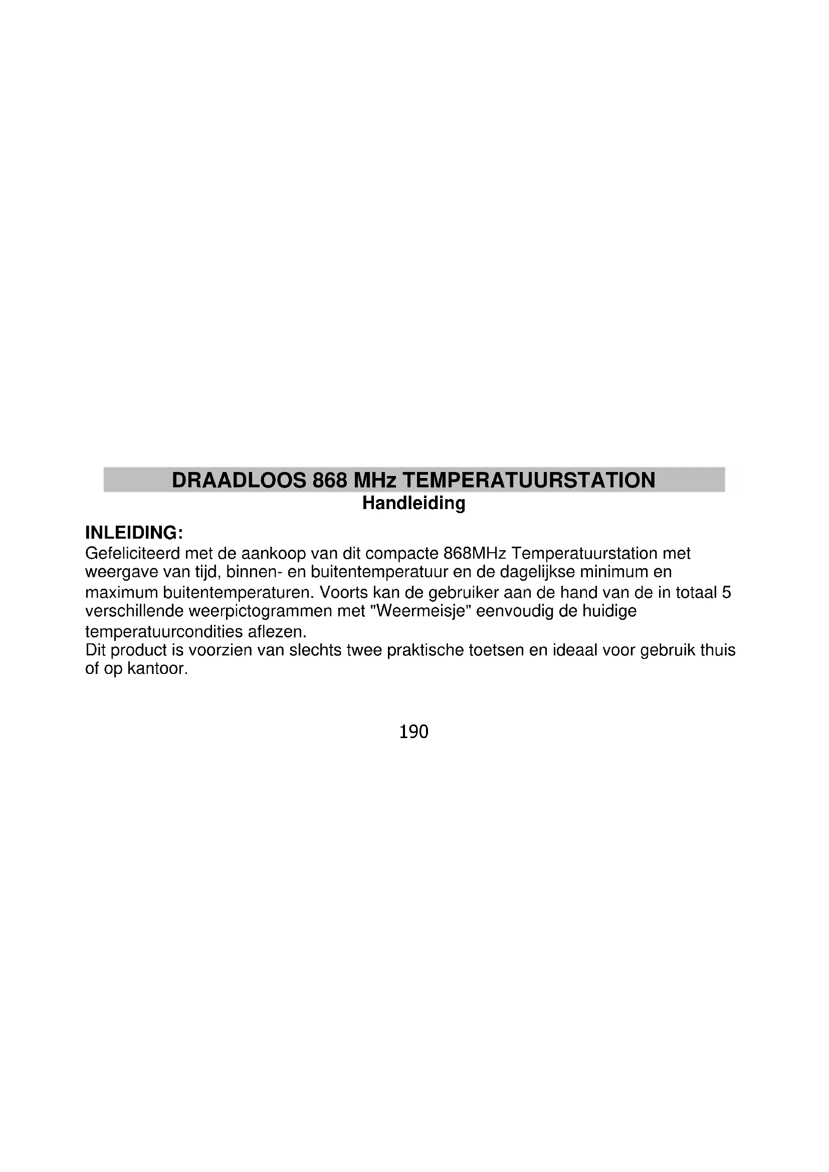 Handleiding INLEIDING: Gefeliciteerd met de aankoop van dit compacte 868MHz Temperatuurstation met weergave van tijd, binnen- en buitentemperatuur en de dagelijkse minimum en maximum buitentemperaturen. Voorts kan de gebruiker aan de hand van de in totaal 5 verschillende weerpictogrammen met "Weermeisje" eenvoudig de huidige temperatuurcondities aflezen. Dit product is voorzien van slechts twee praktische toetsen en ideaal voor gebruik thuis of op kantoor.191