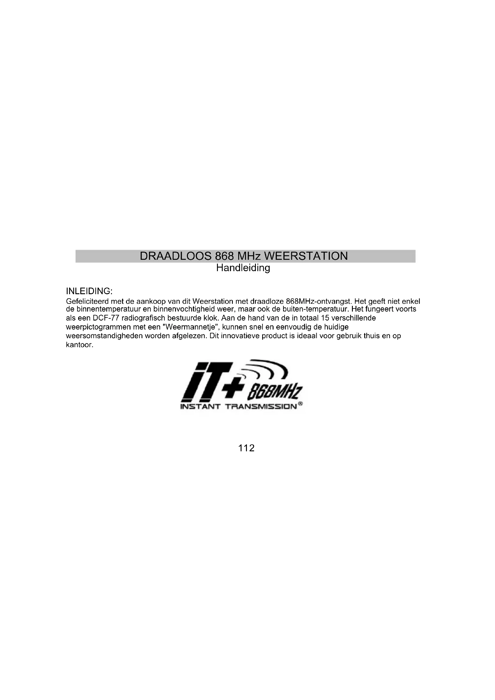 Handleiding INLEIDING: Gefeliciteerd met de aankoop van dit Weerstation met draadloze 868MHz-ontvangst. Het geeft niet enkel de binnentemperatuur en binnenvochtigheid weer, maar ook de buiten-temperatuur. Het fungeert voorts als een DCF-77 radiografisch bestuurde klok. Aan de hand van de in totaal 15 verschillende weerpictogrammen met een "Weermannetje", kunnen snel en eenvoudig de huidige weersomstandigheden worden afgelezen. Dit innovatieve product is ideaal voor gebruik thuis en op kantoor.113 LCD- scherm EIGENSCHAPPEN: Het Weerstation Standaard Deksel batterijvak Ophanggaatje Functietoetsen114 EIGENSCHAPPEN: