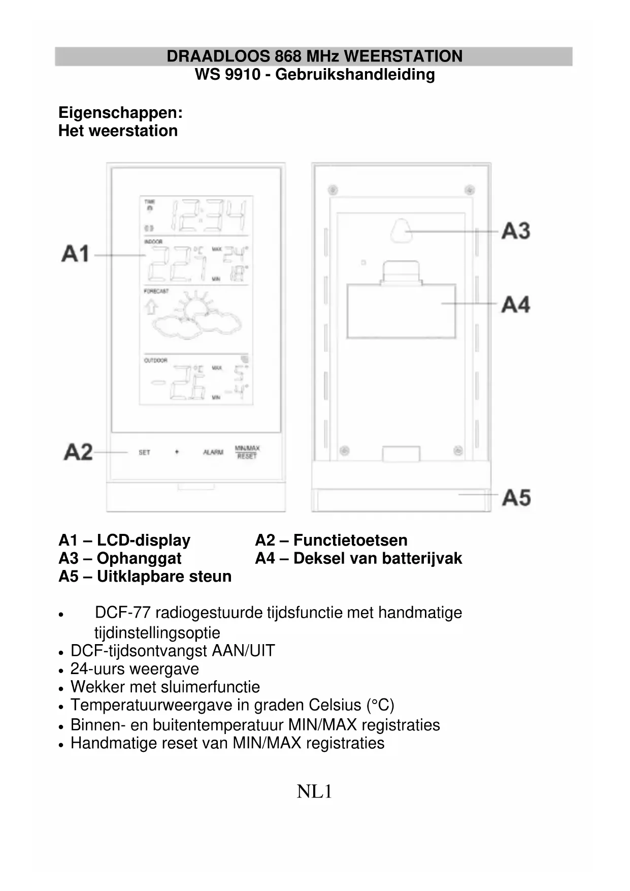 A1 – LCD-display A2 – Functietoetsen A3 – Ophanggat A4 – Deksel van batterijvak A5 – Uitklapbare steun DCF-77 radiogestuurde tijdsfunctie met handmatige tijdinstellingsoptie DCF-tijdsontvangst AAN/UIT 24-uurs weergave Wekker met sluimerfunctie Temperatuurweergave in graden Celsius (°C) Binnen- en buitentemperatuur MIN/MAX registraties Handmatige reset van MIN/MAX registratiesNL2 3 symbolen voor de weersvoorspelling met indicator voor de weertendens Draadloze overdracht op 868 MHz Signaalontvangst op intervallen van 4 seconden Lage batterij indicator Muurmontage of geplaatst op een tafel (uitklapbare steun) De buitentemperatuursensor Externe signaaloverdracht van buitentemperatuur naar temperatuurstation via 868 MHz signalen Douchebestendige behuizing Muurmontage en geplaatst op een tafel Als u uw product naar Midden-Europa wilt brengen, dan zal deze automatisch het radiogestuurde tijdssignaal vinden. Als u naar Het Verenigde Koninkrijk wilt gaan, gebruik dan de handmatige tijdinstellingsoptie. Instelling: Opmerking: Dit weerstation ontvangt slechts één buitensensor.