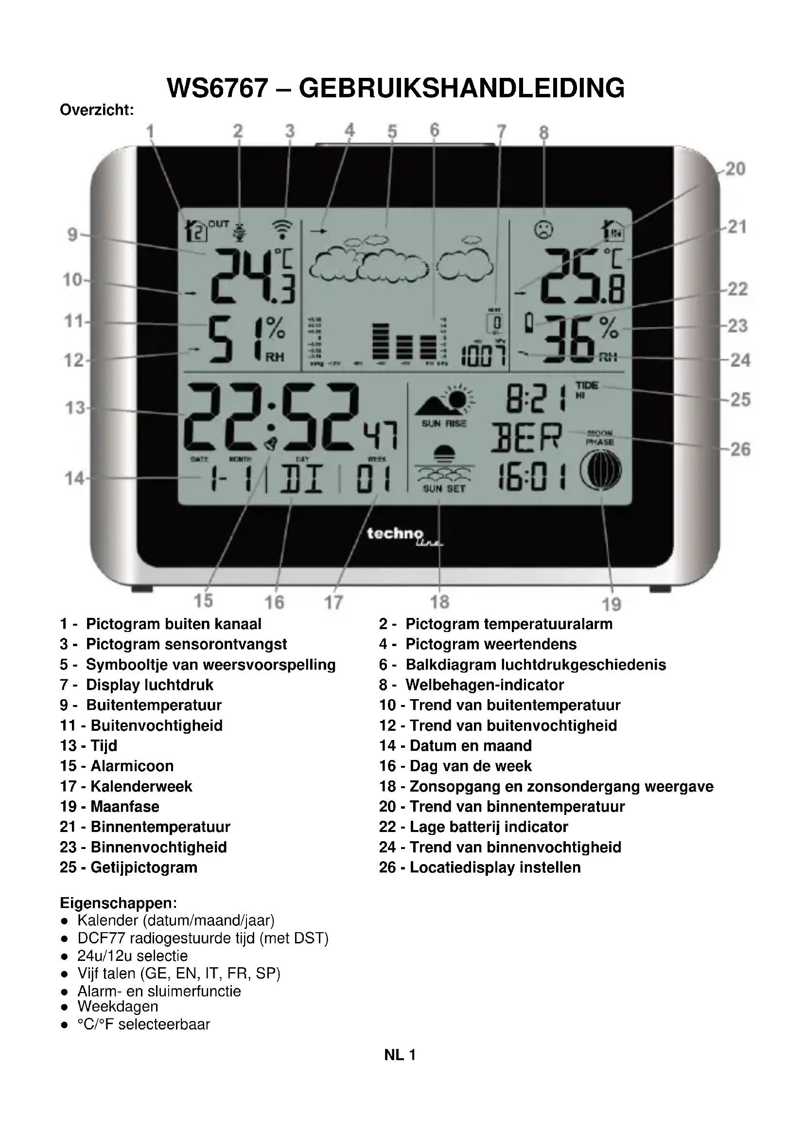 Eigenschappen: ● Kalender (datum/maand/jaar) ● DCF77 radiogestuurde tijd (met DST) ● 24u/12u selectie ● Vijf talen (GE, EN, IT, FR, SP) ● Alarm- en sluimerfunctie ● Weekdagen ● °C/°F selecteerbaarNL 2 ● Maanfase ● Temperatuur en luchtvochtigheid binnen/buiten ● Tendens van temperatuur en luchtvochtigheid binnen/buiten ● Zonsopkomst/Zonsondergang ● Binnen/buiten lage voedingsspanning-indicator ● Indicator comfortniveau binnen ● Instellen tijdzone ● Weeknummer ● Vloed/midden/eb display ● Balkdiagram luchtdruk ● Weerstation ● Binnen/buiten temperatuur/vochtigheid min/max metingen ● Geselecteerd kanaal ● Selecteren locatie ● Temperatuuralarm ● Vorstalarm Batterijen: Ontvanger (WS6767): 2 X AA Sensor (TX960-TH): 2 X AAA Volledig LCD display: