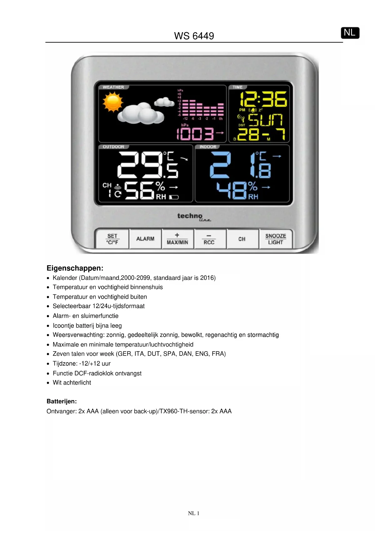 om het alarm te activeren of de-activeren. Het pictogram alarm zal permanent worden weergegeven zolang het alarm geactiveerd is en het pictogram alarm zal niet meer worden weergegeven wanneer het alarm is gedeactiveerd. Druk nogmaals op de knop “ALARM” om te bevestigen en keer terug naar de normale weergavemodus. “ALM” zal niet meer zichtbaar zijn op de weergave. ENGELS DUITS FRANS ITALIAANS NEDERLANDS SPAANS DEENSNL 5 Alarminstelling Druk de knop “ALARM” button in en houd deze voor 3 seconden vast in normale weergavemodus om naar alarminstellingsmodus te gaan. Het alarmuur zal knipperen. Druk op de knop “+” of “-” om het gewenste alarmuur te selecteren. Druk op de knop “ALARM” om te bevestigen en verder te gaan. De alarmminuten zullen knipperen. Druk op de knop “+” of “-” om de alarmminuten in te stellen. Druk op de knop “ALARM” om te bevestigen en keer terug naar de normale weergavemodus. Opmerking: Als binnen 20 seconden geen knoppen zijn ingedrukt zal de alarminstellingsmodus in timeout gaan en terugkeren naar de normale weergavemodus waarbij aanpassingen die door de gebruiker zijn gedaan voor de timeout zullen worden gebruikt. +/- knop: Druk eenmaal om aan te passen met 1 stap, en houd vast om sneller te scrollen. Wanneer het alarm klinkt, zal het voor 2 minuten actief blijven en vervolgens volledig uitschakelen. Sluimerfunctie Druk op de knop “SNOOZE/LIGHT” en de witte achterverlichting zal voor 10 seconden worden ingeschakeld. Wanneer het alarm afgaat, druk op de knop “SNOOZE/LIGHT” om de sluimerfunctie voor 10 minuten in te schakelen. Het alarmicoontje zal knipperen terwijl de sluimerfunctie actief is. Opmerking: Om het alarm voor een dag te stoppen, druk op elke knop behalve de knop “SNOOZE/LIGHT”, wanneer u zich in de sluimermodus bevindt. Het pictogram alarm zal stoppen met knipperen. Functie achterlicht Met de adapter zal de achterverlichting van de weergave altijd aanstaan. Zonder de adapter, druk op de knop “SNOOZE/LIGHT” om de achterverlichting voor 10 seconden aan te zetten. MAX/MIN-waarden: In de normale weergavemodus, druk op de knop “MIN/MAX” om de maximale temperatuur/vochtigheid weer te geven. Druk nogmaals op de knop “MIN/MAX” om de minimale termpatuur/vochtigheid weer te geven. Druk en houd de knop “MIN/MAX” voor 3 seconden in op overeenkomstige interface om het geheugen van de maximale of minimale temperatuur/vochtigheid te wissen. Na 5 seconden zal de weergave terugkeren naar de normale weergavemodus. De MIN/MAX waarden worden ook elke middernacht (0:00) automatisch gewist. Barometer,druk en geschiedenisgegevens van de laatste 12 uur van luchtdruk Geschiedenis van luchtdruk kan worden weergegeven in hPa voor de laatste 12 uur. Het staafdiagram geeft de trend weer van de luchtdruk van de laatste 12 uren in 6 intervallen: 0u, -1u, -2u, -3u, -6u, en -12u. “0u” geeft de opname weer van de luchtdruk van het huidige uur. De kolommen geven de “hPa” (0, ±2, ±4, ±6) weer van een specifieke tijd. De “0” in het midden van deze schaal is gelijk aan de huidige druk en elke verandering (±2, ±4, ±6) geeft weer hoe laag of hoog de “hPa” in de afgelopen druk was in vergelijking met de huidige druk.NL 6 Voor accurate baromatische luchtdruktrends moet het weerstation functioneren op dezelfde hoogte tijdens alle opnames (bijv. hij moet niet zijn verplaatst van de begane grond naar de tweede verdieping van het huis). Wanneer het apparaat is verplaatst naar een nieuwe locatie moeten de opnames voor de volgende 12 uur worden uitgesloten. Weersvoorspelling 5 Pictogrammen van weersvoorspelling kunnen worden weergeven: zonnig, gedeeltelijk zonnig, bewolkt, regenachtig en stormachtig Opmerking: De weersvoorspelling is bepaald door de temperatuur, vochtigheid en luchtdruk. Het symbooltje voor de weersvoorspelling komt mogelijk niet overeen met de huidige weersomstandigheden. Veranderen van temperatuureenheid Druk op de knop “°C/°F” om te wisselen van temperatuureenheid van °C of °F. Indicator lage batterij Het weerstation weergeeft het pictogram voor lage batterij ter herinerring dat de batterijen van het weerstation of van de buitenzender moeten worden vervangen. Batterij-icoontje voor binnentemperatuur-Vervang de batterijen in de klok. Batterij-icoontje voor buitentemperatuur-Vervang de batterijen in de sensor. Hierbij verklaart Technotrade dat de producten WS 6449 en TX960-TH in overeenstemming is met de essentiële eisen en de andere relevante bepalingen van richtlijn 2014/53/EU en ROHS 2011/65/EG. De oorspronkelijke EU-verklaring van overeenstemming is te vinden op: www.technoline.de/doc/4029665064499 Specificaties Zendfrequentie: 433 MHz Maximaal zendvermogen: 8 dBm Voedingseenheid: HX0180500150A2E Binnentemperatuur: Temperatuurbereik = -9,9°C tot 50°C (14°F tot 122°F) Nauwkeurigheid ± 1 graden Celsius 0°C tot 50°C (32°F to122°F) Resolutie = 0,1 graden Celsius Boven 50°C (122°F), zal de LCD HI weergeven Beneden -9,9°C (14°F) zal de LCD LO weergeven Vochtigheid binnenshuis: Vochtigheidsbereik =20% RH tot 95% Nauwkeurigheid +/- 5% RH Resolutie = 1 % RH Buitentemperatuur: Temperatuurbereik = -40°C tot 60°C (-40°F tot 140°F)NL 7 Nauwkeurigheid ± 1 graden Celsius van 0°C tot 50°C (32°F tot 122°F) Nauwkeurigheid ±1,5 graden Celsius -40°C tot 0°C (-40°F tot 32°F) en 50°C tot 60°C (122°F tot 140°F) Resolutie = 0,1 graden Celsius Boven 60°C (140°F), zal de LCD HI weergeven Beneden -40°C (-40°F), zal de LCD LO weergeven Buitenvochtigheid: Vochtigheidsbereik =20% RH tot 95% Nauwkeurigheid +/- 5% RH Resolutie = 1 % RH Standaard instelling: Tijd: 0:00 Temperatuur: ºC Pictogrammen weersvoorspelling: gedeeltelijk zonnig Germaanse weekweergave Omgevingseffecten op ontvangst Het station verkrijgt de exacte tijd via draadloze technologie. Zoals met alle draadloze apparatuur, kan de ontvangst in de volgende gevallen worden aangetast: Lange zendafstand Nabij bergen en valleien