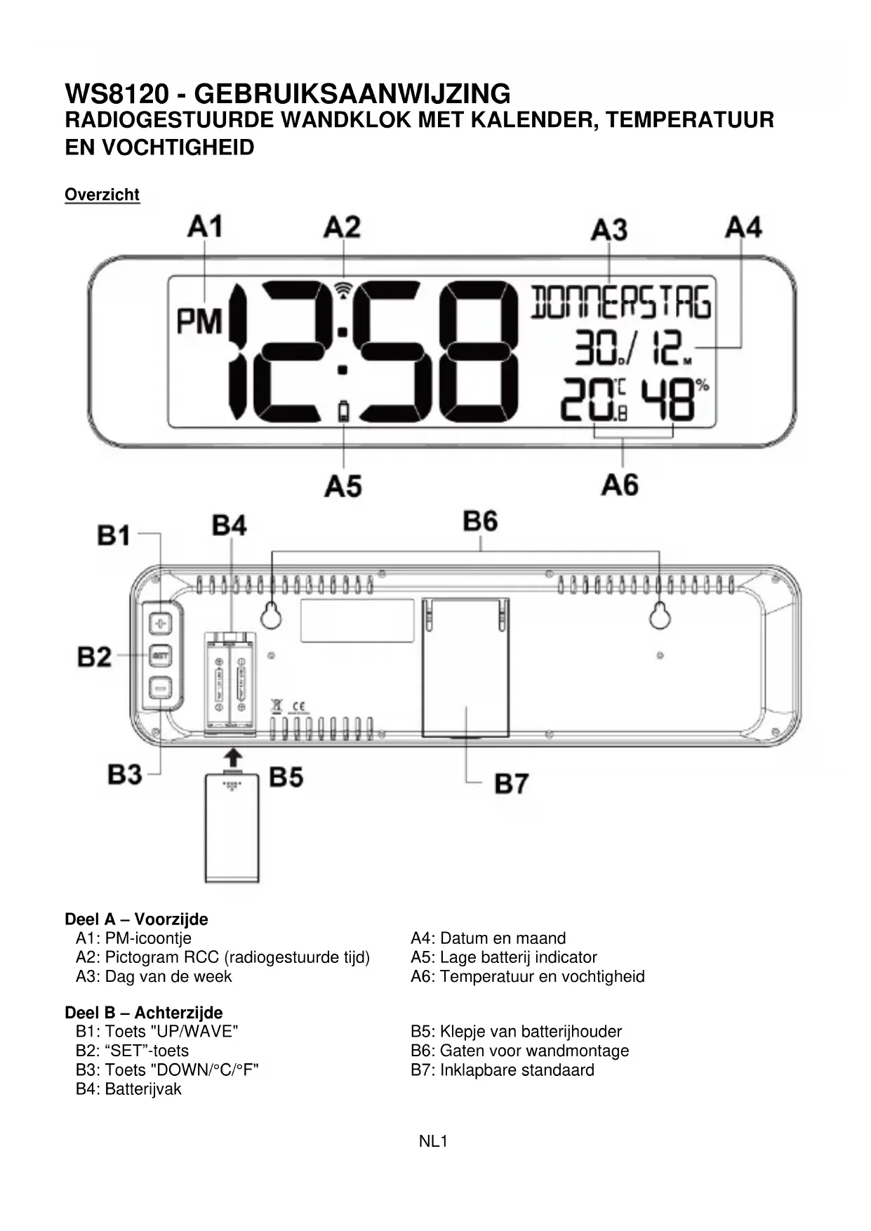 Deel A – Voorzijde A1: PM-icoontje A4: Datum en maand A2: Pictogram RCC (radiogestuurde tijd) A5: Lage batterij indicator A3: Dag van de week A6: Temperatuur en vochtigheid