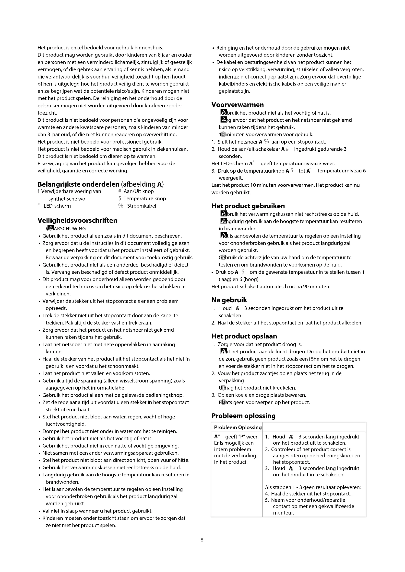 contact op met een gekwaliceerde monteur. Het product is enkel bedoeld voor gebruik binnenshuis. Dit product mag worden gebruikt door kinderen van 8 jaar en ouder en personen met een verminderd lichamelijk, zintuiglijk of geestelijk vermogen, of die gebrek aan ervaring of kennis hebben, als iemand die verantwoordelijk is voor hun veiligheid toezicht op hen houdt of hen is uitgelegd hoe het product veilig dient te worden gebruikt en ze begrijpen wat de potentiële risico's zijn. Kinderen mogen niet met het product spelen. De reiniging en het onderhoud door de gebruiker mogen niet worden uitgevoerd door kinderen zonder toezicht. Dit product is niet bedoeld voor personen die ongevoelig zijn voor warmte en andere kwetsbare personen, zoals kinderen van minder dan 3 jaar oud, of die niet kunnen reageren op oververhitting. Het product is niet bedoeld voor professioneel gebruik. Het product is niet bedoeld voor medisch gebruik in ziekenhuizen. Dit product is niet bedoeld om dieren op te warmen. Elke wijziging van het product kan gevolgen hebben voor de veiligheid, garantie en correcte werking. Belangrijkste onderdelen (afbeelding A) 1 Verwijderbare voering van synthetische wol 2 LED-scherm 3 Aan/Uit knop 4 Temperature knop 5 Stroomkabel Veiligheidsvoorschriften