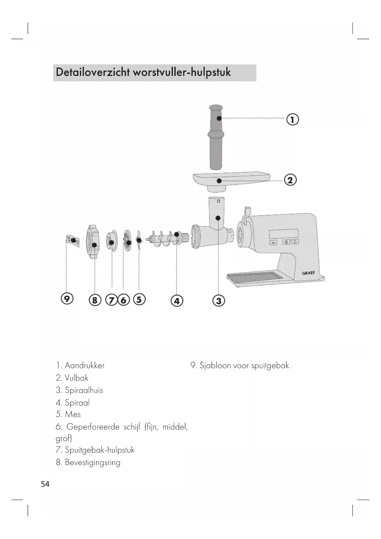 - Trek vóór het reinigen de stekker uit het stopcontact. Laat alle onderdelen na de reiniging goed drogen. Monteer het vleesmo- len-opzetstuk weer. Klantendienst Mocht het gebeuren, dat uw Graef-apparaat beschadigd is, dient u contact op te nemen met uw speciaalzaak of de Graef klantendienst 02932-9703677 of schrijf ons een email service@graef.de.63
