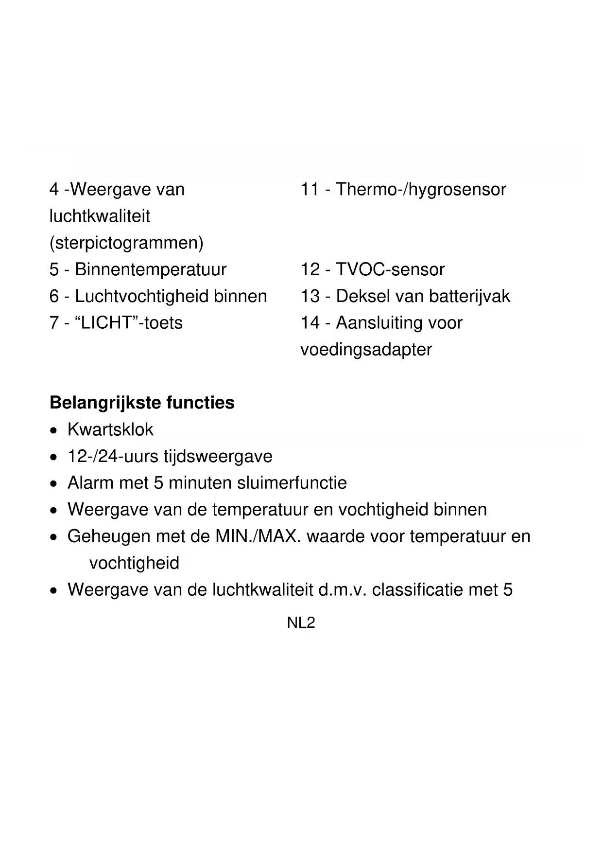 Belangrijkste functies Kwartsklok 12-/24-uurs tijdsweergave Alarm met 5 minuten sluimerfunctie Weergave van de temperatuur en vochtigheid binnen Geheugen met de MIN./MAX. waarde voor temperatuur en vochtigheid Weergave van de luchtkwaliteit d.m.v. classificatie met 5NL3 sterpictogrammen Indicator lage batterij Wit achterlicht Verandert in geel: ventilatie aanbevolen Verandert in rood: De luchtkwaliteitssensor (TVOC sensor) meet zeer hoge waarden en ventilatie is dringend nodig Aan de slag: Gebruik met USB-adapter Gebruik uitsluitend de meegeleverde USB-adapter om een apparaat dat wordt voorzien van stroom aan te sluiten op de WL 1020. Of gebruik een standaard DC 5,0 V/1 A USB- adapter (niet inbegrepen) om de USB-adapterkabel aan te sluiten op een huishoudelijk stopcontact. Gebruik met batterijen Verwijder het deksel van het batterijvak van de WL 1020,NL4 installeer 2 x type AAA-batterijen en let daarbij op de juiste polariteit [markeringen “+” en “–”]. Sluit het klepje van de batterijhouder weer. Opmerkingen De luchtkwaliteitssensor zal ongeveer 15 seconden lang worden geïnitialiseerd en vervolgens wordt de vijf- sterrenclassificatie van de luchtkwaliteit bijgewerkt. Plaats de WL 1020 stevig op een vlak oppervlak met aan alle zijden volgende vrije ruimte. De TVOC-sensor en thermo-/hygrosensor binnenin de WL 1020 bieden op deze manier de beste resultaten. Tijd- en alarmtijdinstelling Houd in de normale weergavemodus de “SET”-toets 3 seconden ingedrukt om de instellingsmodus te openen. Druk op de toets “+” of “-” om de instelling aan te passenNL5 en druk op de toets “SET” om elke instelling te bevestigen. Houd de toets “+” of “-” ingedrukt om de instellingen sneller te doorlopen en de gewenste waarde sneller te bereiken. De instellingen worden als volgt achtereenvolgens doorlopen: 12-/24-uurs weergave -> uur -> minuut -> uur van alarmtijd -> minuut van alarmtijd -> afsluiten Opmerking: De instellingen zullen automatisch worden verlaten en het apparaat keert terug naar de weergavemodus als u 10 seconden lang geen aanpassingen maakt met de toetsen. Alarm in-/uitschakelen: Druk op de “SET”-toets om het alarm in of uit te schakelen. Het alarmpictogram wordt weergegeven zolang het alarm is ingeschakeld.NL6 Alarm- en sluimerfunctie: Het alarmpictogram knippert wanneer het alarm klinkt. Druk op de “LICHT”-toets om het sluimeralarm te activeren (alarmpictogram blijft knipperen op de LCD) of druk op een willekeurige andere toets om het alarm te stoppen en de volgende dag om dezelfde tijd weer te laten klinken. Druk tijdens de actieve sluimerfunctie op een willekeurige andere toets dan “LICHT” om het sluimeralarm te stoppen. Opmerking: Het alarm zal 2 minuten klinken en geleidelijk in intensiteit verhogen voordat het alarm automatisch stopt wanneer niet onderbroken door op een van de toetsen te drukken. Temperatuur en luchtvochtigheid Druk in de normale weergavemodus op de “°C/°F”-toetsNL7 om de temperatuurweergave te wisselen tussen °C en °F. Maximum/minimum temperatuur & vochtigheid Druk in de normale weergavemodus op de “+”- toets om de maximum- en minimumwaarden van de temperatuur en vochtigheid te bekijken. MAX zal worden weergegeven wanneer de maximale waarden worden weergegeven, terwijl MIN wordt weergegeven voor de minimale waarden. Informatie over de TVOC- en CO2-sensor De TVOC- en CO2-meters (koolstofdioxide) maken gebruik van metaaloxidesensoren met langdurige stabiliteit en lage drift. TVOC is de afkorting van totale vluchtige organische stoffen, die duizenden verbindingen bevat. CO2, de sensor meet de CO2 in de omgeving niet direct,NL8 maar de geschatte waarde wordt afgeleid uit andere relevante parameters van de sensor. Luchtkwaliteit testen Wanneer de WL 1020 wordt voorzien van stroom via USB- kabel: De luchtkwaliteitssensor (TVOC) blijft altijd ingeschakeld. Wanneer de WL 1020 wordt voorzien van stroom via batterijen: Houd de “LICHT”-toets 3 seconden ingedrukt om de sensor te activeren. De vijf-sterrenclassificatie van de luchtkwaliteit zal binnen 15 seconden worden bijgewerkt en weergegeven. De sensortestmodus zal na 5 minuten worden uitgeschakeld om energie te besparen en te voorkomenNL9 dat de batterijen te snel uitgeput raken. De display zal de status van de laatste meting blijven weergeven Weergave van de luchtkwaliteit De luchtkwaliteit wordt weergegeven door 5 sterpictogrammen die veranderen op basis van de gemeten CO2-waarde: Weergegeven pictogrammen Waardebereik Luchtkwalit eit