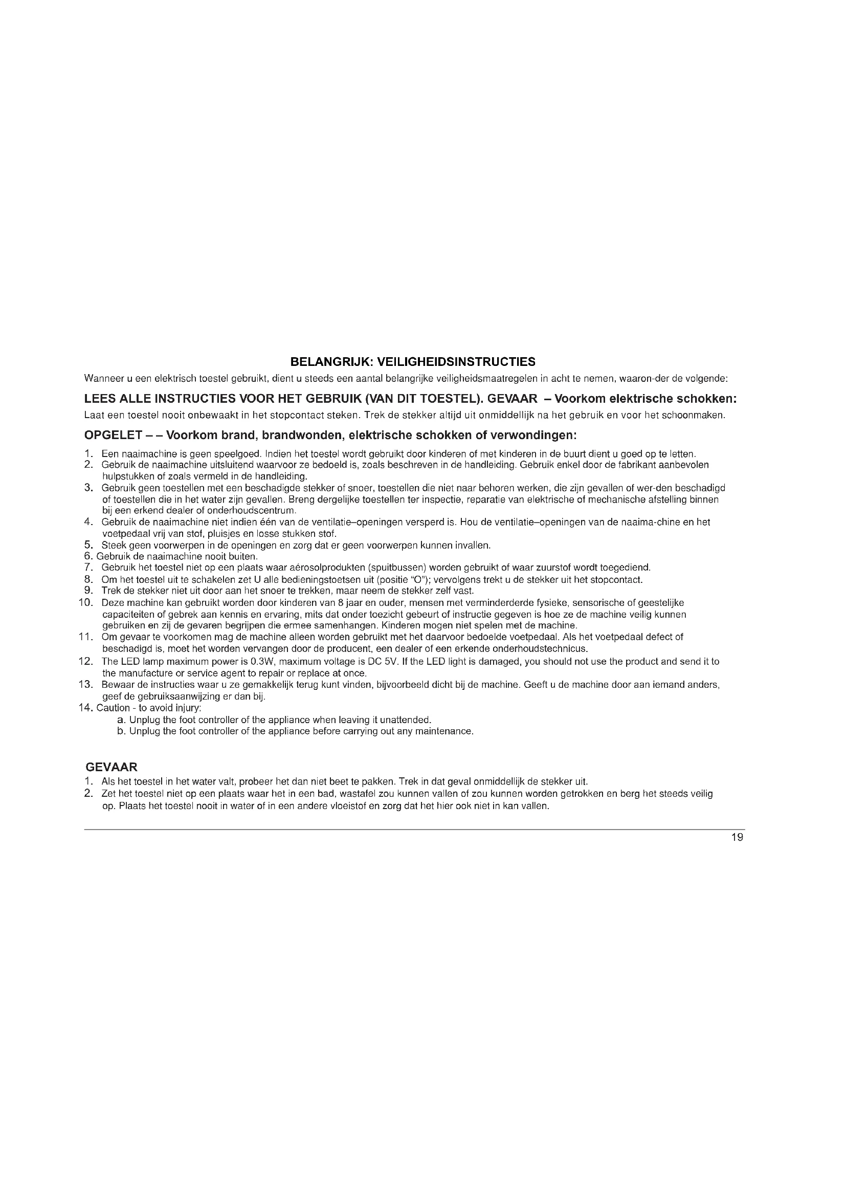 10. Deze machine kan gebruikt worden door kinderen van 8 jaar en ouder, mensen met verminderderde fysieke, sensorische of geestelijke capaciteiten of gebrek aan kennis en ervaring, mits dat onder toezicht gebeurt of instructie gegeven is hoe ze de machine veilig kunnen gebruiken en zij de gevaren begrijpen die ermee samenhangen. Kinderen mogen niet spelen met de machine. 11. Om gevaar te voorkomen mag de machine alleen worden gebruikt met het daarvoor bedoelde voetpedaal. Als het voetpedaal defect of beschadigd is, moet het worden vervangen door de producent, een dealer of een erkende onderhoudstechnicus. 12. The LED lamp maximum power is 0.3W, maximum voltage is DC 5V. If the LED light is damaged, you should not use the product and send it to the manufacture or service agent to repair or replace at once. 13. Bewaar de instructies waar u ze gemakkelijk terug kunt vinden, bijvoorbeeld dicht bij de machine. Geeft u de machine door aan iemand anders, geef de gebruiksaanwijzing er dan bij.
