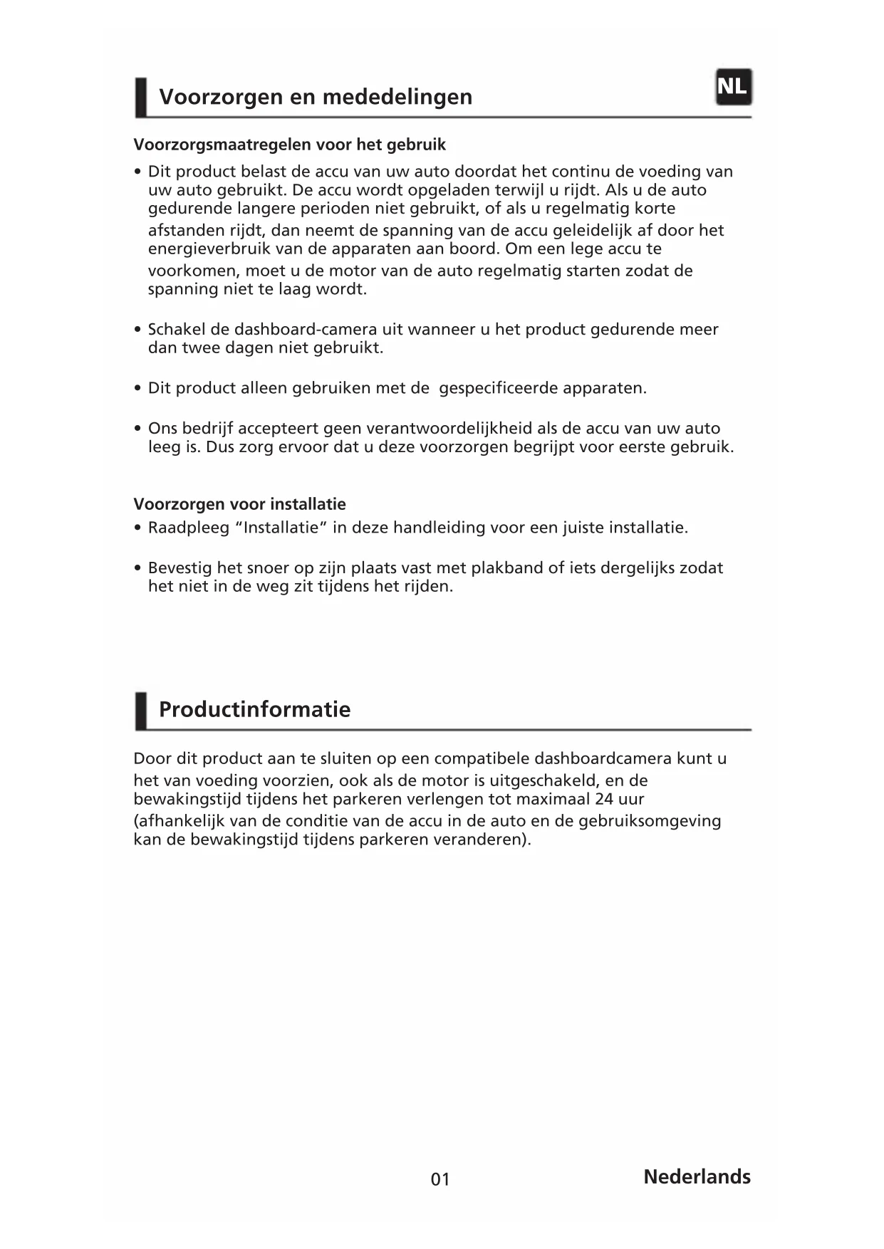 Voorzorgsmaatregelen voor het gebruik Voorzorgen voor installatie Productinformatie Door dit product aan te sluiten op een compatibele dashboardcamera kunt u het van voeding voorzien, ook als de motor is uitgeschakeld, en de bewakingstijd tijdens het parkeren verlengen tot maximaal 24 uur (afhankelijk van de conditie van de accu in de auto en de gebruiksomgeving kan de bewakingstijd tijdens parkeren veranderen).
