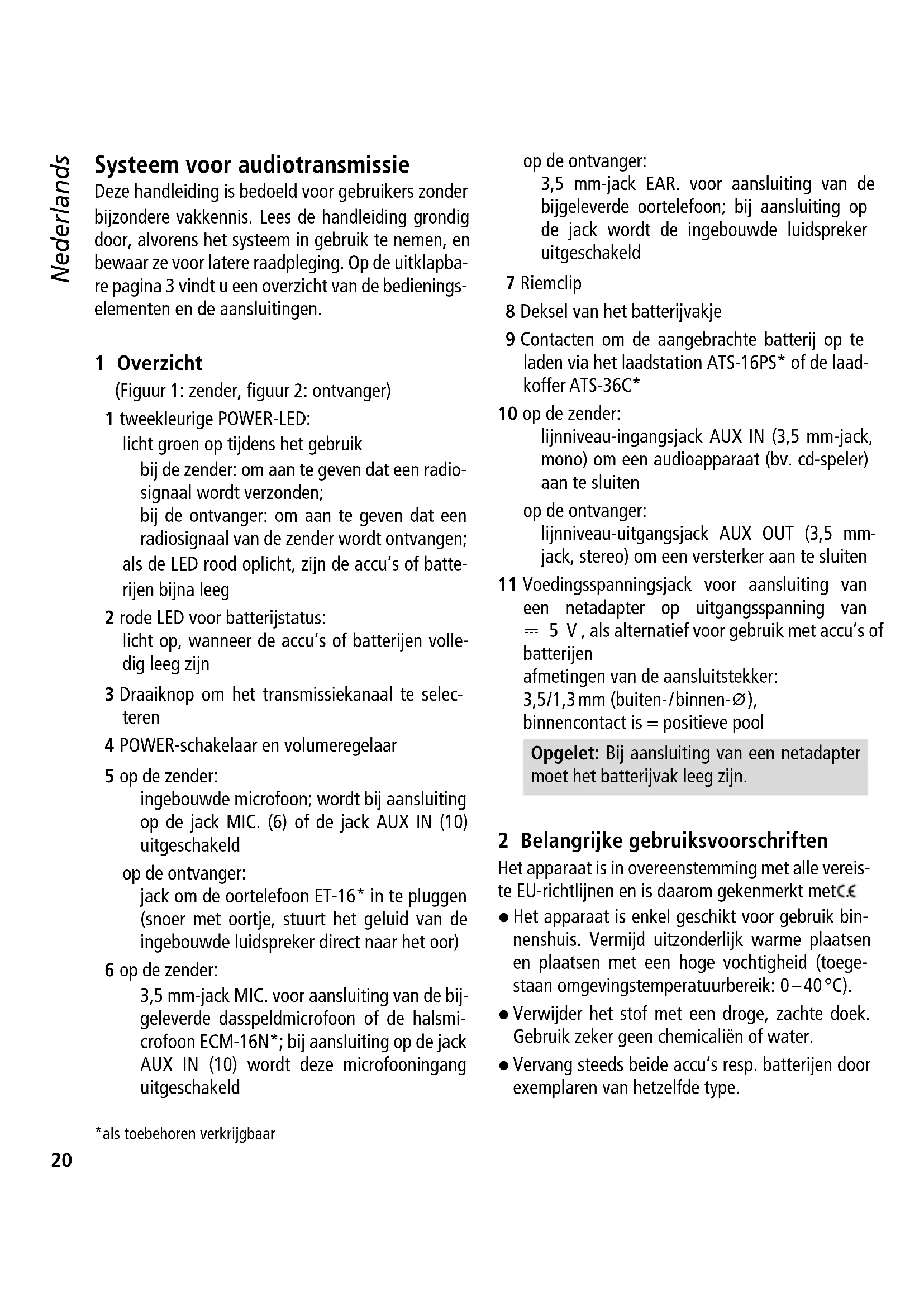 INTERNATIONAL GmbH & Co. KG si riserva ogni diritto di elaborazione in qualsiasi forma delle pre- senti istruzioni per l’uso. La riproduzione – anche parziale – per propri scopi commerciali è vietata.20 Nederlands Deutsch Deutsch Seite Inhalt English English Page Contents Français Français Page Table des matières Italiano Italiano Pagina Indice Español Español Página Contenidos Polski Polski Strona Spis treści Magyar Magyar Oldal Systeem voor audiotransmissie Deze handleiding is bedoeld voor gebruikers zonder bijzondere vakkennis. Lees de handleiding grondig door, alvorens het systeem in gebruik te nemen, en bewaar ze voor latere raadpleging. Op de uitklapba- re pagina 3 vindt u een overzicht van de bedienings- elementen en de aansluitingen. 1 Overzicht (Figuur 1: zender, figuur 2: ontvanger) 1 tweekleurige POWER-LED: licht groen op tijdens het gebruik bij de zender: om aan te geven dat een radio- signaal wordt verzonden; bij de ontvanger: om aan te geven dat een radiosignaal van de zender wordt ontvangen; als de LED rood oplicht, zijn de accu’s of batte- rijen bijna leeg 2 rode LED voor batterijstatus: licht op, wanneer de accu’s of batterijen volle- dig leeg zijn 3 Draaiknop om het transmissiekanaal te selec- teren 4 POWER-schakelaar en volumeregelaar 5 op de zender: ingebouwde microfoon; wordt bij aansluiting op de jack MIC. (6) of de jack AUX IN (10) uitgeschakeld op de ontvanger: jack om de oortelefoon ET-16* in te pluggen (snoer met oortje, stuurt het geluid van de ingebouwde luidspreker direct naar het oor) 6 op de zender: 3,5 mm-jack MIC. voor aansluiting van de bij- geleverde dasspeldmicrofoon of de halsmi- crofoon ECM-16N*; bij aansluiting op de jack AUX IN (10) wordt deze microfooningang uitgeschakeld op de ontvanger: 3,5 mm-jack EAR. voor aansluiting van de bijgeleverde oortelefoon; bij aansluiting op de jack wordt de ingebouwde luidspreker uitgeschakeld 7 Riemclip 8 Deksel van het batterijvakje 9 Contacten om de aangebrachte batterij op te laden via het laadstation ATS-16PS* of de laad- koffer ATS-36C* 10 op de zender: lijnniveau-ingangsjack AUX IN (3,5 mm-jack, mono) om een audioapparaat (bv. cd-speler) aan te sluiten op de ontvanger: lijnniveau-uitgangsjack AUX OUT (3,5 mm- jack, stereo) om een versterker aan te sluiten 11 Voedingsspanningsjack voor aansluiting van een netadapter op uitgangsspanning van