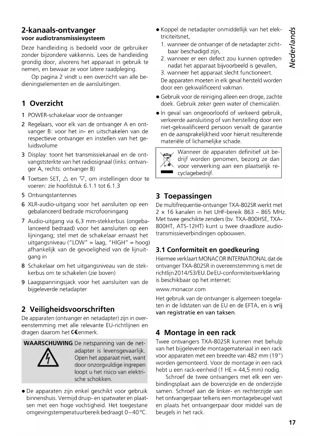 Hiermee verklaart MONACOR INTERNATIONAL dat de ontvanger TXA-802SR in overeenstemming is met de richtlijn 2014 / 53 / EU. De EU- conformiteitsverklaring is beschikbaar op het internet: www.monacor.com Het gebruik van de ontvanger is algemeen toegela- ten in de lidstaten van de EU en de EFTA, en is vrij van registratie en van taksen. 4 Montage in een rack Twee ontvangers TXA-802SR kunnen met behulp van het bijgeleverde montagemateriaal in een rack voor apparaten met een breedte van 482 mm (19”) worden gemonteerd. Voor de montage in een rack hebt u een rack-eenheid (1 HE = 44,5 mm) nodig. Schroef de twee ontvangers met elk een ver- bindingsplaat aan de bovenzijde en de onderzijde samen. Schroef aan de linker- en rechterzijde van het ontvangerpaar telkens een montagebeugel vast en plaats het ontvangerpaar door middel van de beugels in het rack.18 Nederlands 5 Ingebruikneming