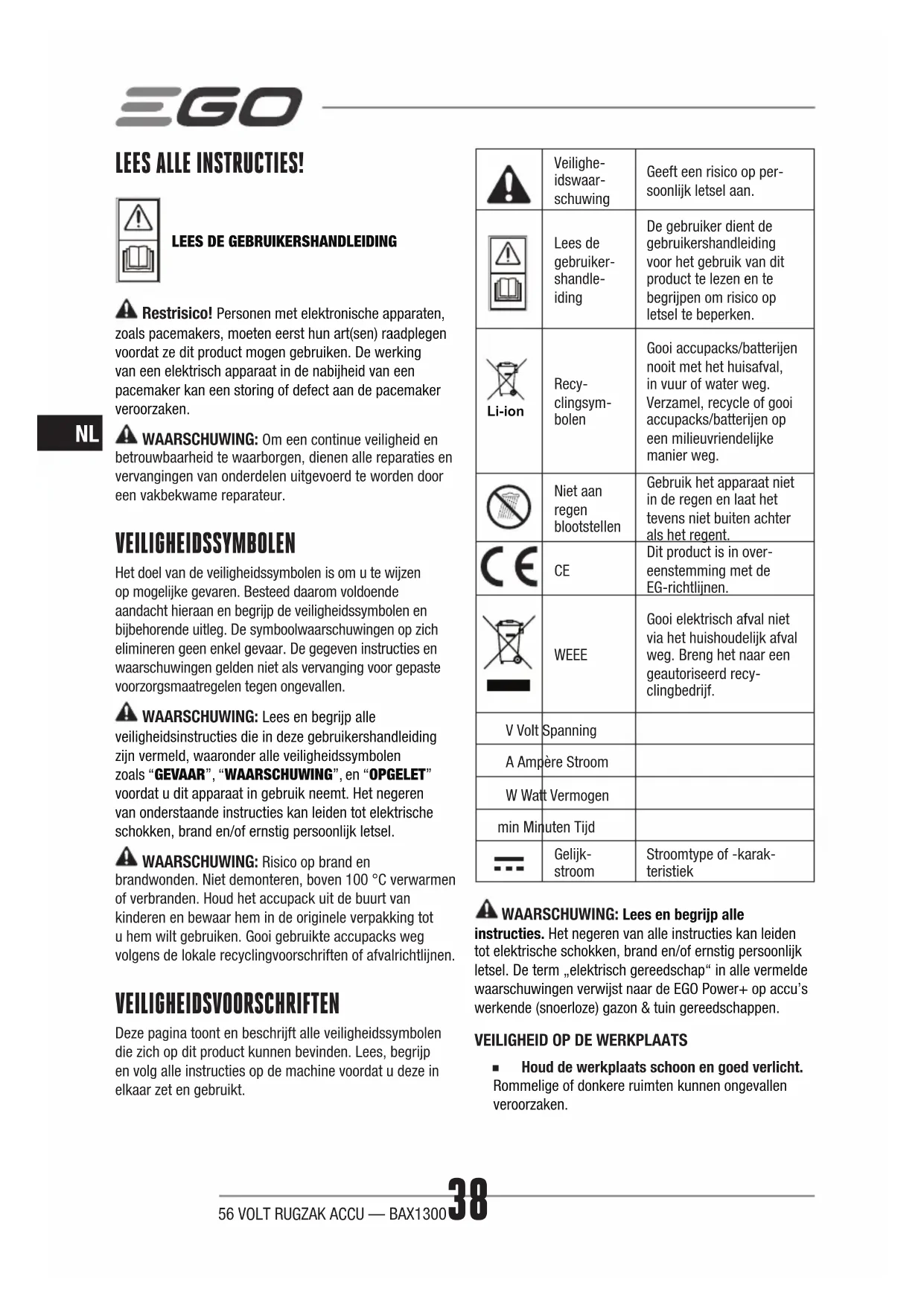 Restrisico! Personen met elektronische apparaten, zoals pacemakers, moeten eerst hun art(sen) raadplegen voordat ze dit product mogen gebruiken. De werking van een elektrisch apparaat in de nabijheid van een pacemaker kan een storing of defect aan de pacemaker veroorzaken. WAARSCHUWING: Om een continue veiligheid en betrouwbaarheid te waarborgen, dienen alle reparaties en vervangingen van onderdelen uitgevoerd te worden door een vakbekwame reparateur. VEILIGHEIDSSYMBOLEN Het doel van de veiligheidssymbolen is om u te wijzen op mogelijke gevaren. Besteed daarom voldoende aandacht hieraan en begrijp de veiligheidssymbolen en bijbehorende uitleg. De symboolwaarschuwingen op zich elimineren geen enkel gevaar. De gegeven instructies en waarschuwingen gelden niet als vervanging voor gepaste voorzorgsmaatregelen tegen ongevallen. WAARSCHUWING: Lees en begrijp alle veiligheidsinstructies die in deze gebruikershandleiding zijn vermeld, waaronder alle veiligheidssymbolen zoals “GEVAAR”, “WAARSCHUWING”, en “OPGELET” voordat u dit apparaat in gebruik neemt. Het negeren van onderstaande instructies kan leiden tot elektrische schokken, brand en/of ernstig persoonlijk letsel. WAARSCHUWING: Risico op brand en brandwonden. Niet demonteren, boven 100 °C verwarmen of verbranden. Houd het accupack uit de buurt van kinderen en bewaar hem in de originele verpakking tot u hem wilt gebruiken. Gooi gebruikte accupacks weg volgens de lokale recyclingvoorschriften of afvalrichtlijnen. VEILIGHEIDSVOORSCHRIFTEN Deze pagina toont en beschrijft alle veiligheidssymbolen die zich op dit product kunnen bevinden. Lees, begrijp en volg alle instructies op de machine voordat u deze in elkaar zet en gebruikt.Veilighe-idswaar-schuwingGeeft een risico op per-soonlijk letsel aan.Lees de gebruiker-shandle-idingDe gebruiker dient de gebruikershandleiding voor het gebruik van dit product te lezen en te begrijpen om risico op letsel te beperken. Li-ion Recy-clingsym-bolenGooi accupacks/batterijen nooit met het huisafval, in vuur of water weg. Verzamel, recycle of gooi accupacks/batterijen op een milieuvriendelijke manier weg.Niet aan regen blootstellenGebruik het apparaat niet in de regen en laat het tevens niet buiten achter als het regent. Dit product is in over-eenstemming met de EG-richtlijnen. WEEE Gooi elektrisch afval niet via het huishoudelijk afval weg. Breng het naar een geautoriseerd recy-clingbedrijf.V Volt SpanningA Ampère StroomW Watt Vermogenmin Minuten TijdGelijk-stroomStroomtype of -karak-teristiek WAARSCHUWING: Lees en begrijp alle instructies. Het negeren van alle instructies kan leiden tot elektrische schokken, brand en/of ernstig persoonlijk letsel. De term „elektrisch gereedschap“ in alle vermelde waarschuwingen verwijst naar de EGO Power+ op accu’s werkende (snoerloze) gazon & tuin gereedschappen.