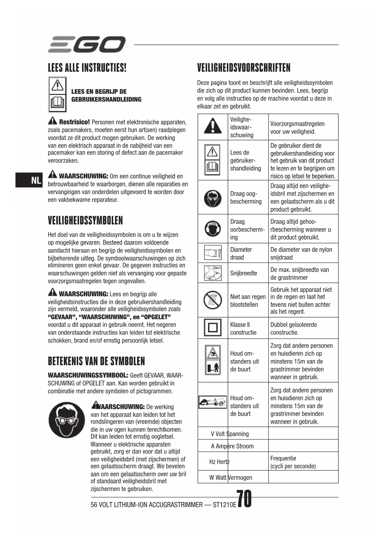 WAARSCHUWINGSSYMBOOL: Geeft GEVAAR, WAAR- SCHUWING of OPGELET aan. Kan worden gebruikt in combinatie met andere symbolen of pictogrammen. WAARSCHUWING: De werking van het apparaat kan leiden tot het rondslingeren van (vreemde) objecten die in uw ogen kunnen terechtkomen. Dit kan leiden tot ernstig oogletsel. Wanneer u elektrische apparaten gebruikt, zorg er dan voor dat u altijd een veiligheidsbril (met zijschermen) of een gelaatsscherm draagt. We bevelen aan om een gelaatsscherm over uw bril of standaard veiligheidsbril met zijschermen te gebruiken. VEILIGHEIDSVOORSCHRIFTEN Deze pagina toont en beschrijft alle veiligheidssymbolen die zich op dit product kunnen bevinden. Lees, begrijp en volg alle instructies op de machine voordat u deze in elkaar zet en gebruikt. Veilighe- idswaar- schuwing Voorzorgsmaatregelen voor uw veiligheid. Lees de gebruiker- shandleiding De gebruiker dient de gebruikershandleiding voor het gebruik van dit product te lezen en te begrijpen om risico op letsel te beperken. Draag oog- bescherming Draag altijd een veilighe- idsbril met zijschermen en een gelaatscherm als u dit product gebruikt. Draag oorbescherm- ing Draag altijd gehoo- rbescherming wanneer u dit product gebruikt. Ø2mm Diameter draad De diameter van de nylon snijdraad Snijbreedte De max. snijbreedte van de grastrimmer Niet aan regen blootstellen Gebruik het apparaat niet in de regen en laat het tevens niet buiten achter als het regent. Klasse II constructie Dubbel geïsoleerde constructie. Houd om- standers uit de buurt Zorg dat andere personen en huisdieren zich op minstens 15m van de grastrimmer bevinden wanneer in gebruik. 15m Houd om- standers uit de buurt Zorg dat andere personen en huisdieren zich op minstens 15m van de grastrimmer bevinden wanneer in gebruik. V Volt Spanning A Ampère Stroom Hz Hertz Frequentie (cycli per seconde) W Watt Vermogen56 VOLT LITHIUM-ION ACCUGRASTRIMMER — ST1210E