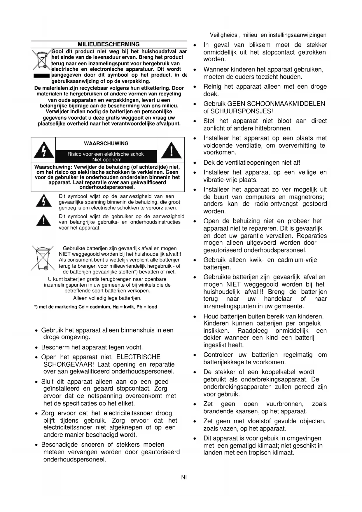 U kunt batterijen gratis terugbrengen naar openbare inzamelingspunten in uw gemeente of bij winkels die de betreffende soort batterijen verkopen. Alleen volledig lege batterijen. *) met de markering Cd = cadmium, Hg = kwik, Pb = lood
