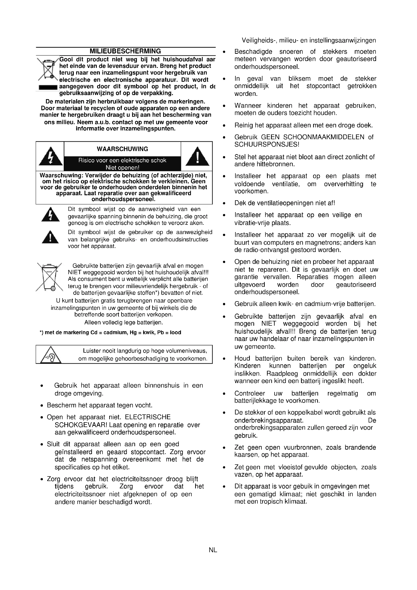- Gebruik alleen kwik- en cadmium-vrije batterijen.