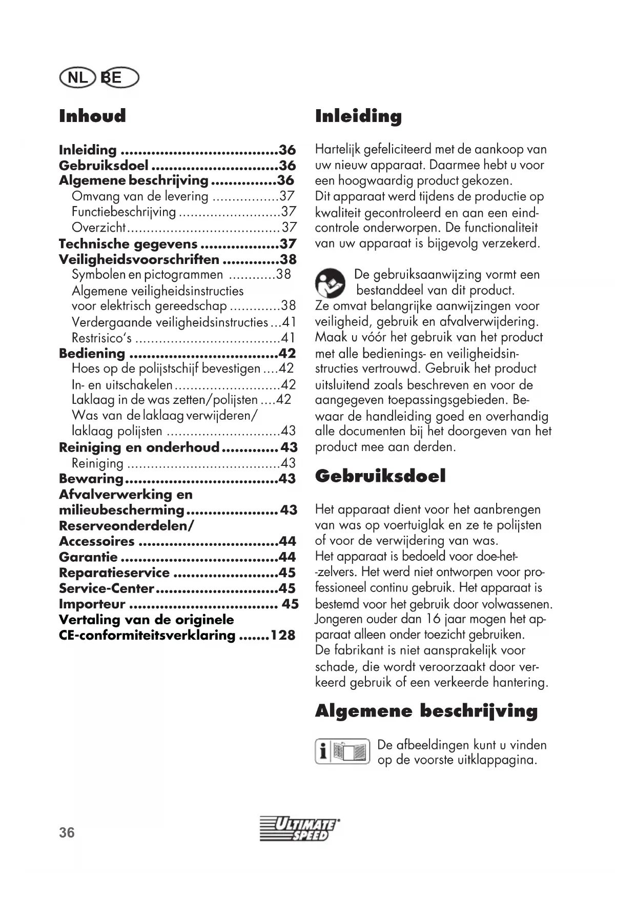 - Importeur Inleiding Hartelk gefeliciteerd met de aankoop van uw nieuw apparaat. Daarmee hebt u voor een hoogwaardig product gekozen. Dit apparaat werd tdens de productie op kwaliteit gecontroleerd en aan een eind- controle onderworpen. De functionaliteit van uw apparaat is bgevolg verzekerd. De gebruiksaanwzing vormt een bestanddeel van dit product. Ze omvat belangrke aanwzingen voor veiligheid, gebruik en afvalverwdering. Maak u vóór het gebruik van het product met alle bedienings- en veiligheidsin- structies vertrouwd. Gebruik het product uitsluitend zoals beschreven en voor de aangegeven toepassingsgebieden. Be- waar de handleiding goed en overhandig alle documenten b het doorgeven van het product mee aan derden. Gebruiksdoel Het apparaat dient voor het aanbrengen van was op voertuiglak en ze te polsten of voor de verwdering van was. Het apparaat is bedoeld voor doe-het- -zelvers. Het werd niet ontworpen voor pro- fessioneel continu gebruik. Het apparaat is bestemd voor het gebruik door volwassenen. Jongeren ouder dan 16 jaar mogen het ap- paraat alleen onder toezicht gebruiken. De fabrikant is niet aansprakelk voor schade, die wordt veroorzaakt door ver- keerd gebruik of een verkeerde hantering. Algemene beschrving De afbeeldingen kunt u vinden op de voorste uitklappagina. Vertaling van de originele CE-conformiteitsverklaring p. 45