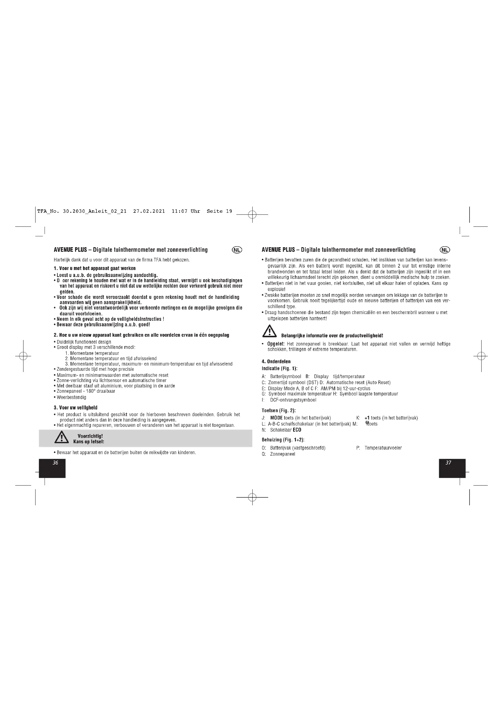 - Bewaar het apparaat en de batterijen buiten de reikwijdte van kinderen. TFA_No. 30.2030_Anleit_02_21 27.02.2021 11:07 Uhr Seite 19AVENUE PLUS – Digitale tuinthermometer met zonneverlichting