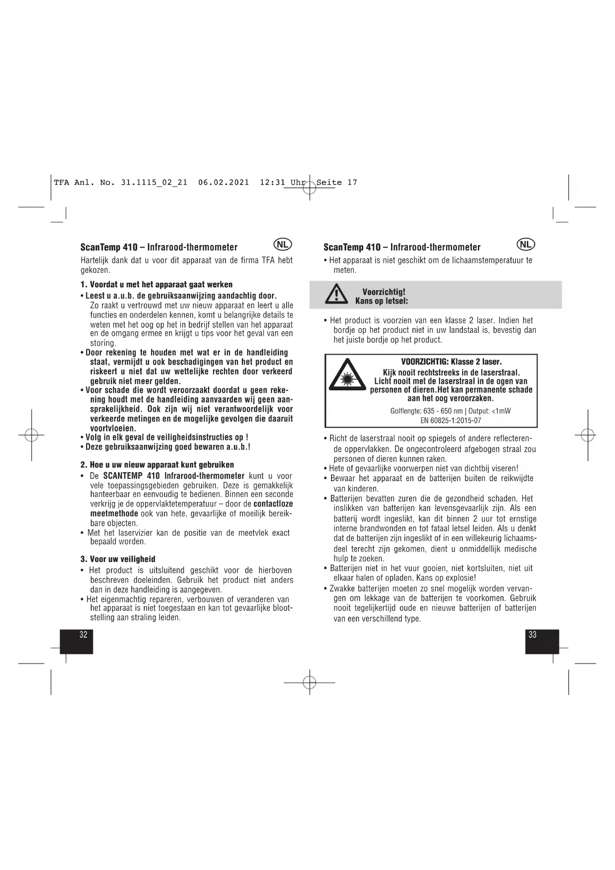 VOORZICHTIG: Klasse 2 laser. Kijk nooit rechtstreeks in de laserstraal. Licht nooit met de laserstraal in de ogen van personen of dieren.Het kan permanente schade aan het oog veroorzaken. Golflengte: 635 - 650 nm | Output: <1mWEN 60825-1:2015-07 TFA Anl. No. 31.1115_02_21 06.02.2021 12:31 Uhr Seite 1735 ScanTemp 410 – Infrarood-thermometer ScanTemp 410 – Infrarood-thermometer