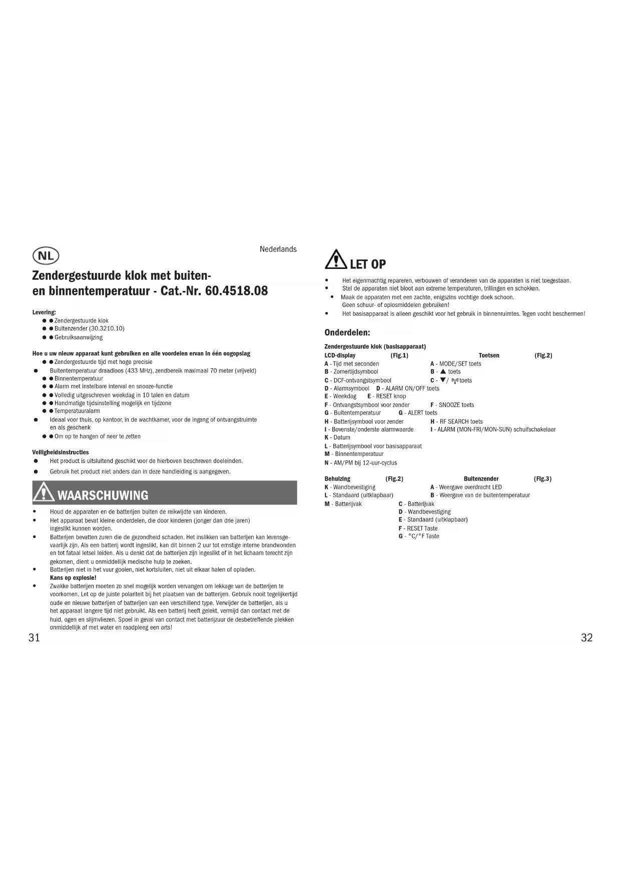 Problema Risoluzione del problema Nessuna indicazione sul display della stazione base/del trasmettitore Inserire le batterie rispettando le corrette polarità Sostituire le batterie Nessuna ricezione del segnale DCF Avviare l’inizializzazione manualmente Attendere il tentativo notturno di ricezione Cercare nuove posizioni per il dispositivo Impostare manualmente l’ora Nessuna ricezione del trasmettitore Indicazione “- - . - “ Nessun trasmettitore installato Controllare le batterie del trasmettitore (non utilizzare le batterie ricaricabili!) Avviare l’inizializzazione del trasmettitore manuale Cercare nuove posizioni per il trasmettitore e/o la stazione base/ diminuire la distanza Indicazione non corretta sul display della stazione base o trasmettitore Sostituire le batterie Stazione base: Premere con un oggetto appuntito il tasto RESET Trasmettitore esterno: Premere il tasto RESET Qualora il vostro apparecchio continui a non funzionare nonostante queste procedure, rivolgetevi al rivenditore presso il quale lo avete acquistato.Dati tecnici Stazione base Alimentazione: 4 batterie AA da 1,5 V (non incluse) Campo di misura - temperatura: -10°C … 50°C / 14°F… 122°F Indicazione LL.L /HH.H: Temperatura fuori dal campo di misura Dimensioni esterne: 248 x 25 (73) x 206 mm Peso: 481 g (solo apparecchio) Trasmettitore esterno Alimentazione: 2 batterie AAA da 1,5 V (non incluse) Campo di misura - temperatura: -20°C … 50°C / -4 °F… 122 °F Raggio d’azione: ca. 70 metri al massimo) Frequenza di trasmissione: 433 Mhz Massima potenza a radiofrequenza trasmessa: < 10 mW Dimensioni esterne: 62 x 24 (35) x 102 mm Peso: 63 g (solo apparecchio) È vietata la pubblicazione delle presenti istruzioni o di parti di esse senza una precedente autorizzazione della TFA Dostmann. I dati tecnici corrispondono allo stato del prodotto al momento della stampa e possono cambiare senza preavviso. È possibile trovare dati tecnici e informazioni aggiornate sul prodotto inserendo il numero di articolo sul nostro sito. Dichiarazione di conformità UE Il fabbricante, TFA Dostmann, dichiara che il tipo di apparecchiatura radio 60.4518 è conforme alla direttiva 2014/53/UE. Il testo completo della dichiarazione di conformità UE è disponibile al seguente indirizzo Internet: www.tfa-dostmann.de/service/downloads/ce www.tfa-dostmann.de E-Mail: info@tfa-dostmann.de 06/2023 TFA Dostmann GmbH & Co. KG | Zum Ottersberg 12 | D-97877 Wertheim | Germania Smaltimento Questo prodotto e il suo imballaggio sono stati realizzati utilizzando materiali e componenti di alta quali- tà che possono essere riciclati e riutilizzati. Questo riduce i riuti e protegge l’ambiente. Smaltire gli imballaggi in modo ecologico attraverso i sistemi di raccolta in vigore. Smaltimento del dispositivo elettrico Rimuovere dal dispositivo le batterie e le batterie ricaricabili estraibili e smaltirle separata- mente. Questo apparecchio è etichettato in conformità alla Direttiva UE sullo smaltimento delle apparecchiature elettriche ed elettroniche (WEEE). Questo prodotto non deve essere smaltito insieme ai riuti domestici. Il consumatore è tenuto a consegnare il vecchio apparecchio presso un punto di raccolta per lo smaltimento di apparecchiature elettriche ed elettroniche ai ni di uno smaltimento ecologico. La restituzione è gratuita. Osservare i regolamenti in vigore Smaltimento delle batterie È assolutamente vietato gettare le batterie e le batterie ricaricabili tra i riuti domestici. Contengono sostanze tossiche che possono danneggiare l’ambiente e la salute se smaltite in modo improprio. In qualità di consumatori, siete tenuti per legge a consegnare le batterie usate al negoziante o ad altri enti preposti al riciclaggio in conformità alle vigenti disposizioni nazionali o locali, ai ni di uno smaltimento ecologico. La restituzione è gratuita. Le sigle dei metalli pesanti contenuti sono: Cd=cadmio, Hg=mercurio, Pb=piombo 29 30Nederlands Zendergestuurde klok met buiten- en binnentemperatuur - Cat.-Nr. 60.4518.08 Levering: Zendergestuurde klok Buitenzender (30.3210.10) Gebruiksaanwijzing Hoe u uw nieuw apparaat kunt gebruiken en alle voordelen ervan in één oogopslag Zendergestuurde tijd met hoge precisie Buitentemperatuur draadloos (433 MHz), zendbereik maximaal 70 meter (vrijveld) Binnentemperatuur Alarm met instelbare interval en snooze-functie Volledig uitgeschreven weekdag in 10 talen en datum Handmatige tijdsinstelling mogelijk en tijdzone Temperatuuralarm Ideaal voor thuis, op kantoor, in de wachtkamer, voor de ingang of ontvangstruimte en als geschenk Om op te hangen of neer te zetten Veiligheidsinstructies Het product is uitsluitend geschikt voor de hierboven beschreven doeleinden. Gebruik het product niet anders dan in deze handleiding is aangegeven. WAARSCHUWING y Houd de apparaten en de batterijen buiten de reikwijdte van kinderen. y Het apparaat bevat kleine onderdelen, die door kinderen (jonger dan drie jaren) ingeslikt kunnen worden. y Batterijen bevatten zuren die de gezondheid schaden. Het inslikken van batterijen kan levensge- vaarlijk zijn. Als een batterij wordt ingeslikt, kan dit binnen 2 uur tot ernstige interne brandwonden en tot fataal letsel leiden. Als u denkt dat de batterijen zijn ingeslikt of in het lichaam terecht zijn gekomen, dient u onmiddellijk medische hulp te zoeken. y Batterijen niet in het vuur gooien, niet kortsluiten, niet uit elkaar halen of opladen. Kans op explosie! y Zwakke batterijen moeten zo snel mogelijk worden vervangen om lekkage van de batterijen te voorkomen. Let op de juiste polariteit bij het plaatsen van de batterijen. Gebruik nooit tegelijkertijd oude en nieuwe batterijen of batterijen van een verschillend type. Verwijder de batterijen, als u het apparaat langere tijd niet gebruikt. Als een batterij heeft gelekt, vermijd dan contact met de huid, ogen en slijmvliezen. Spoel in geval van contact met batterijzuur de desbetreffende plekken onmiddellijk af met water en raadp