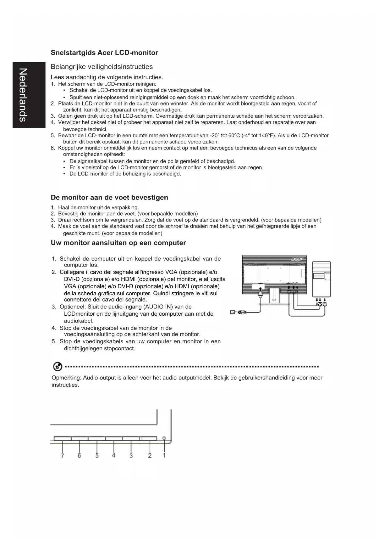 Focus Klok Taal OSD Timeout Wide Mode DDC / CI ACM Invoer Auto Source Quick Start Mode Reset Informatie *Allespecicatieskunnenzondervoorafgaandekennisgevingwordengewijzigd. ZoekhandleidingenenanderedocumentenvooruwAcer-productopdeofciëleondersteuningswebsitevanAcer. *Jaarlijks energieverbruik wordt berekend op basis van standaard stroomverbruik 4 uur per dag, 365 dagen per jaarPolski Instrukcja szybkiego uruchomienia (QSG) monitora LCD Acer Ważne instrukcje dotyczące bezpieczeństwa Należyuważnieprzeczytaćponiższeinstrukcje.