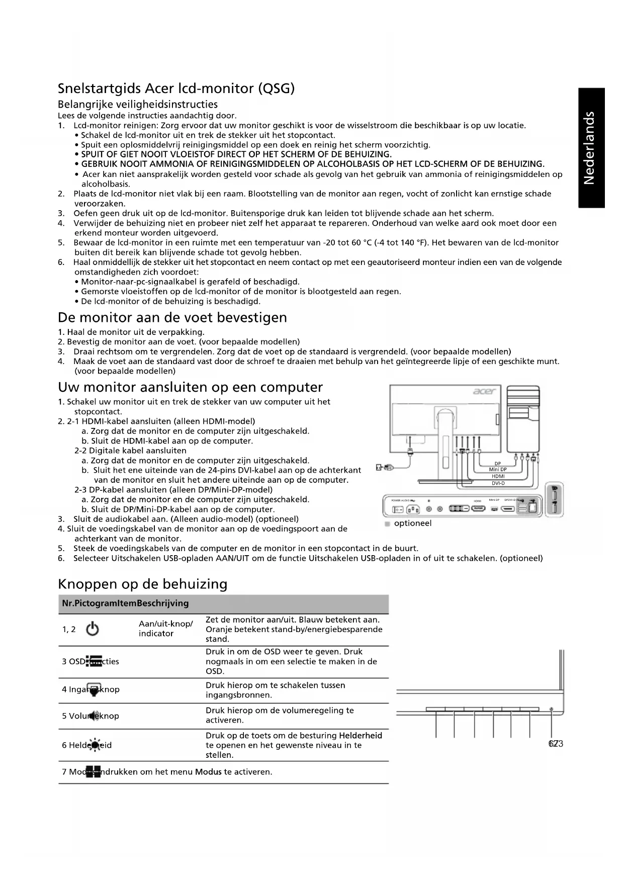 - Consumo energetico annuale 80 (kWh) (per i modelli con ingresso HDMI) Consumo energetico (a 200 nits) Modalità on 41,86 W (Tipico) Modalità sospensione 0,41 W (Tipico) Modalità off 0,26 W (Tipico) Connettore di ingresso HDMI (solo nei modelli con ingresso HDMI) DVI (Dual Link) DP (solo nei modelli con ingresso DP) Mini-DP (solo nei modelli con ingresso Mini-DP) Segnale video in ingresso HDMI (solo nei modelli con ingresso HDMI) DVI (Dual Link) DP (solo nei modelli con ingresso DP) Mini-DP (solo nei modelli con ingresso Mini-DP) Altoparlanti 2 W x 2 (solo nei modelli con ingresso audio) (Opzionale) USB USB 3.0 x 4 (Opzionale) Dimensione massima dello schermo Orizzontale: 596,736 mm Verticale: 335,664 mm Fonte di alimentazione 100-240V, 50/60 Hz Considerazioni ambientali Temperatura operativa: Da 5° a 40°C Temperatura di stoccaggio: Da -20° a 60°C Umidità operativa: Da 20% a 80% Dimensioni 614 (L) x 395,41 ~ 545,41 (A) x 247,17 (P) mm Peso (peso netto) 8,2 kg (netto) Specifiche meccaniche Inclinazione: Da -5° a +35° (inclinazione di 35 gradi solo nel punto più alto dell'angolo di elevazione) Rotazione: Da -60° a +60° Regolazione dell'altezza: Da 0 mm a 150 mm Perno: Da -90° a +90° Piedistallo scollegabile: Sì (piedistallo scollegabile con rilascio della vite) Controlli esterni Switch/Pulsanti Pulsante di alimentazione MENU/INVIO Input Volume Luminosità Modalità Funzioni Luminosità Contrasto Spia blu Potenz. nero ACM Nitidezza alta Gamma Temp. Colore Modalità Mod sRGB Scala di grigi Tonal. 6 assi Satur. 6 assi Volume Mute Over Drive Lingua Intervallo OSD Trasparenza Blocco OSD Input Origine auto Formato DP Assegnazione tasti Schermo intero PIP/PBP DDC/CI Liv nero HDMI Mod Avvio rapido Spegnimento carica USB Informazioni sul display Ripristina tutto Uscita Le specifiche variano a seconda della regione e/o del modello.Nederlands Snelstartgids Acer lcd-monitor (QSG) Belangrijke veiligheidsinstructies Lees de volgende instructies aandachtig door.