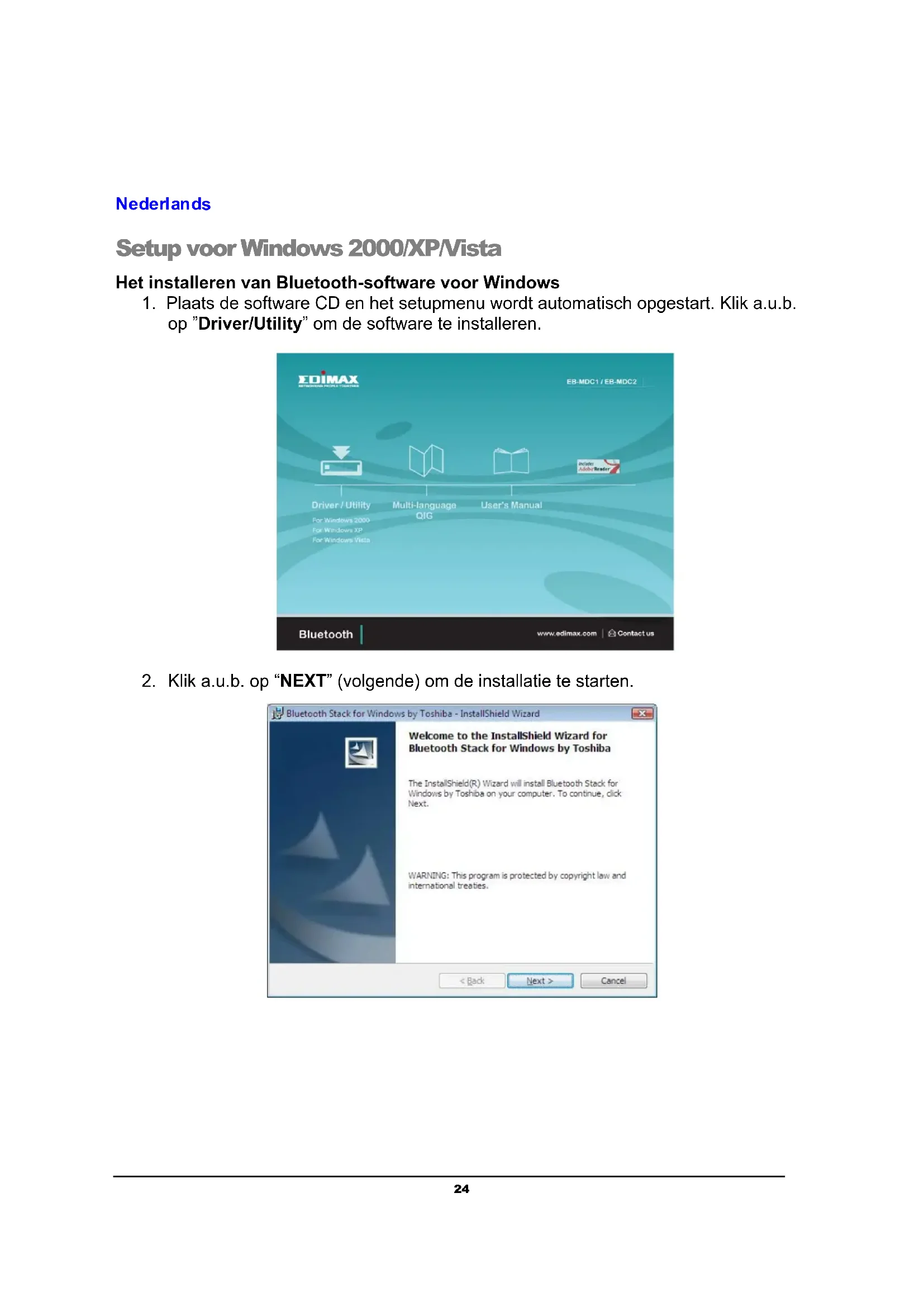 Setup voor Windows 2000/XP/Vista Het installeren van Bluetooth-software voor Windows