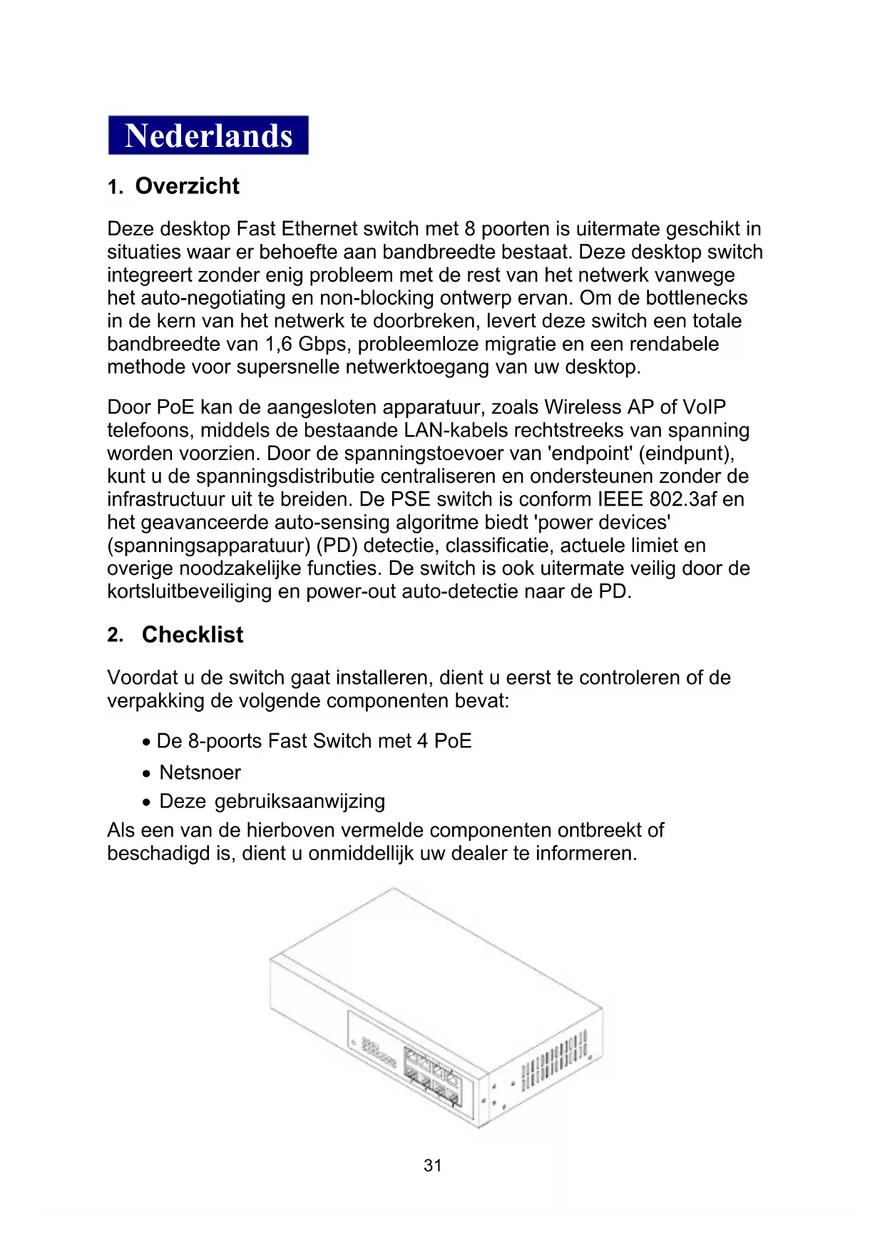 Checklist Voordat u de switch gaat installeren, dient u eerst te controleren of de verpakking de volgende componenten bevat: