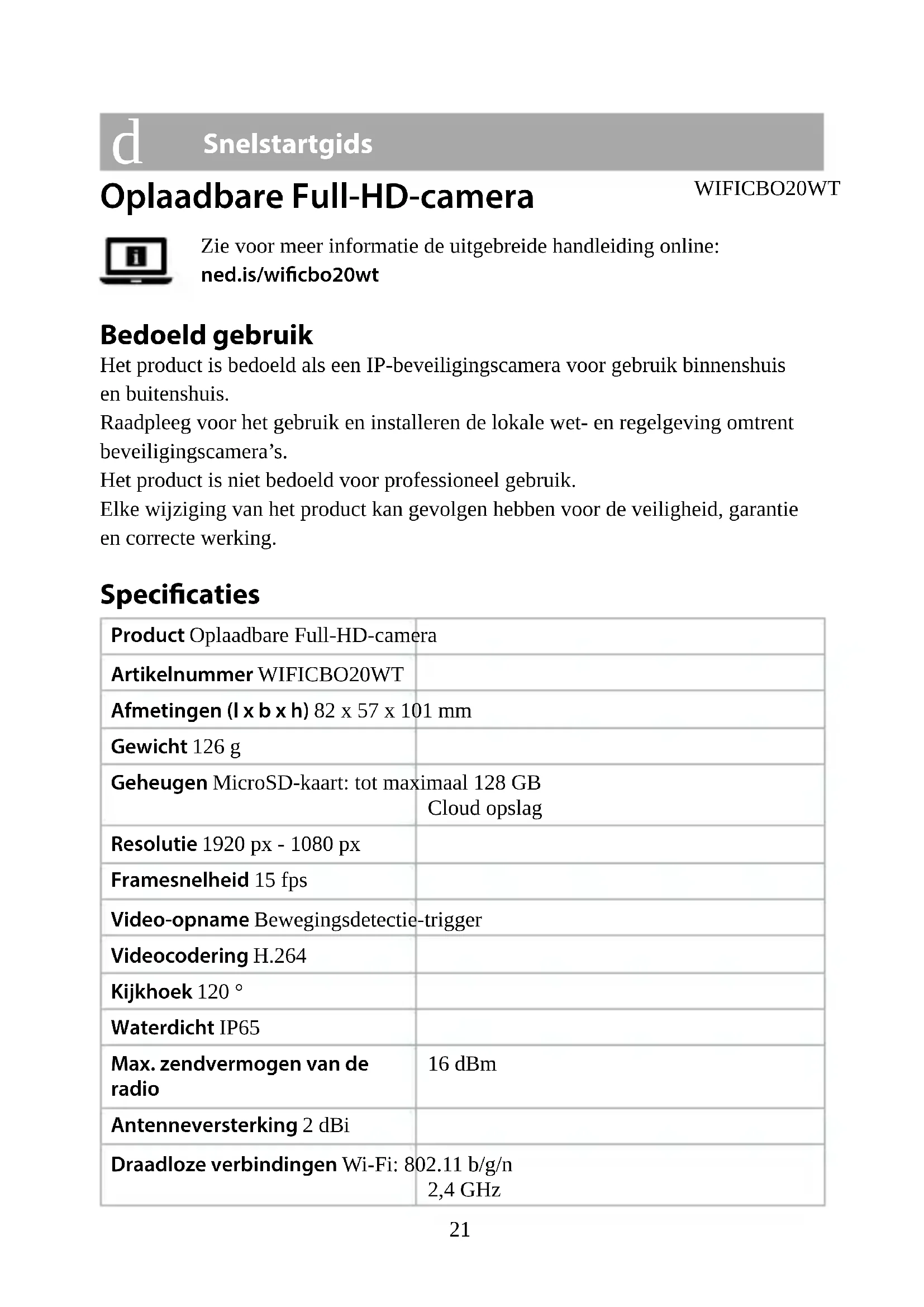 Snelstartgids Oplaadbare Full-HD-camera WIFICBO20WT Zie voor meer informatie de uitgebreide handleiding online: ned.is/wicbo20wt Bedoeld gebruik Het product is bedoeld als een IP-beveiligingscamera voor gebruik binnenshuis en buitenshuis. Raadpleeg voor het gebruik en installeren de lokale wet- en regelgeving omtrent beveiligingscamera’s. Het product is niet bedoeld voor professioneel gebruik. Elke wijziging van het product kan gevolgen hebben voor de veiligheid, garantie en correcte werking. Specicaties Product Oplaadbare Full-HD-camera Artikelnummer WIFICBO20WT Afmetingen (l x b x h) 82 x 57 x 101 mm Gewicht 126 g Geheugen MicroSD-kaart: tot maximaal 128 GB Cloud opslag Resolutie 1920 px - 1080 px Framesnelheid 15 fps Video-opname Bewegingsdetectie-trigger Videocodering H.264 Kijkhoek 120 ° Waterdicht IP65 Max. zendvermogen van de radio 16 dBm Antenneversterking 2 dBi Draadloze verbindingen Wi-Fi: 802.11 b/g/n 2,4 GHz22 Wi-Fi-frequentiebereik 2412 - 2472 MHz Opslagtemperatuur -20 - 60 °C Bedrijfstemperatuur -20 - 55 °C Stroomingang 5 VDC Nachtzicht bereik 6 - 8 m Beeldsensor 2 MP 1/2,9” CMOS-sensor Ingebouwde microfoon - 38 dB Ingebouwde luidspreker 8 Ω 1 W Batterijtype 2 x 18650 (Li-ion) Belangrijkste onderdelen (afbeelding A) 1 Montagebeugel 2 Vergrendelings- schakelaar 3 Cameralens 4 Microfoon 5 Lichtsensor 6 Statusindicatie LED 7 PIR-sensor 8 Micro USB-poort 9 Luidspreker q Micro SD-kaartsleuf w Reset knop e Aan/uit-knop r Batterijcom- partiment t Micro USB-kabel Veiligheidsvoorschriften