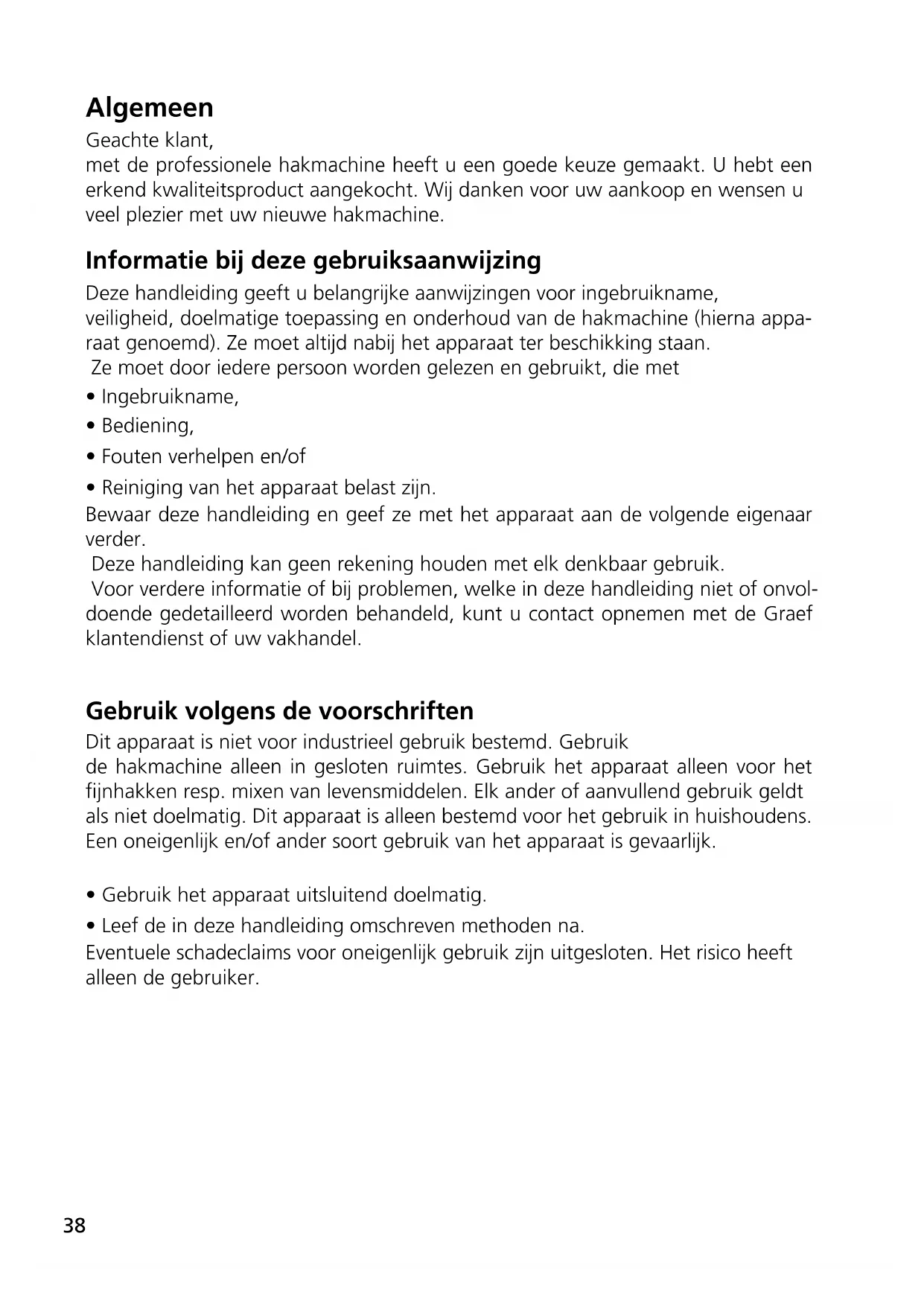 - Reiniging van het apparaat belast zn. Bewaar deze handleiding en geef ze met het apparaat aan de volgende eigenaar verder. Deze handleiding kan geen rekening houden met elk denkbaar gebruik. Voor verdere informatie of b problemen, welke in deze handleiding niet of onvol- doende gedetailleerd worden behandeld, kunt u contact opnemen met de Graef klantendienst of uw vakhandel. Gebruik volgens de voorschriften Dit apparaat is niet voor industrieel gebruik bestemd. Gebruik de hakmachine alleen in gesloten ruimtes. Gebruik het apparaat alleen voor het jnhakken resp. mixen van levensmiddelen. Elk ander of aanvullend gebruik geldt als niet doelmatig. Dit apparaat is alleen bestemd voor het gebruik in huishoudens. Een oneigenlk en/of ander soort gebruik van het apparaat is gevaarlk.