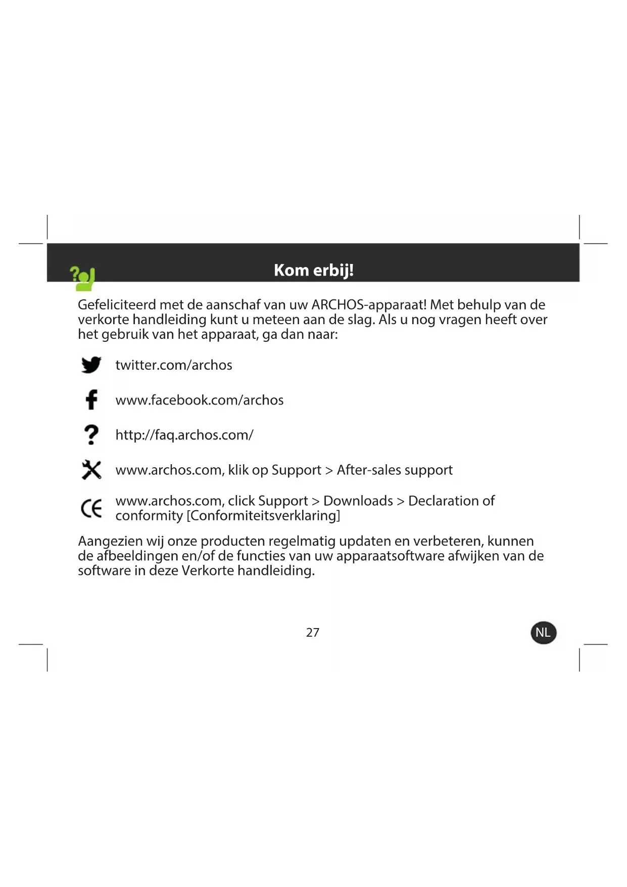 Gefeliciteerd met de aanschaf van uw ARCHOS-apparaat! Met behulp van de verkorte handleiding kunt u meteen aan de slag. Als u nog vragen heeft over het gebruik van het apparaat, ga dan naar: twitter.com/archos www.facebook.com/archos http://faq.archos.com/ www.archos.com, klik op Support > After-sales support www.archos.com, click Support > Downloads > Declaration of conformity [Conformiteitsverklaring] Aangezien wij onze producten regelmatig updaten en verbeteren, kunnen de afbeeldingen en/of de functies van uw apparaatsoftware afwijken van de software in deze Verkorte handleiding. Kom erbij!28