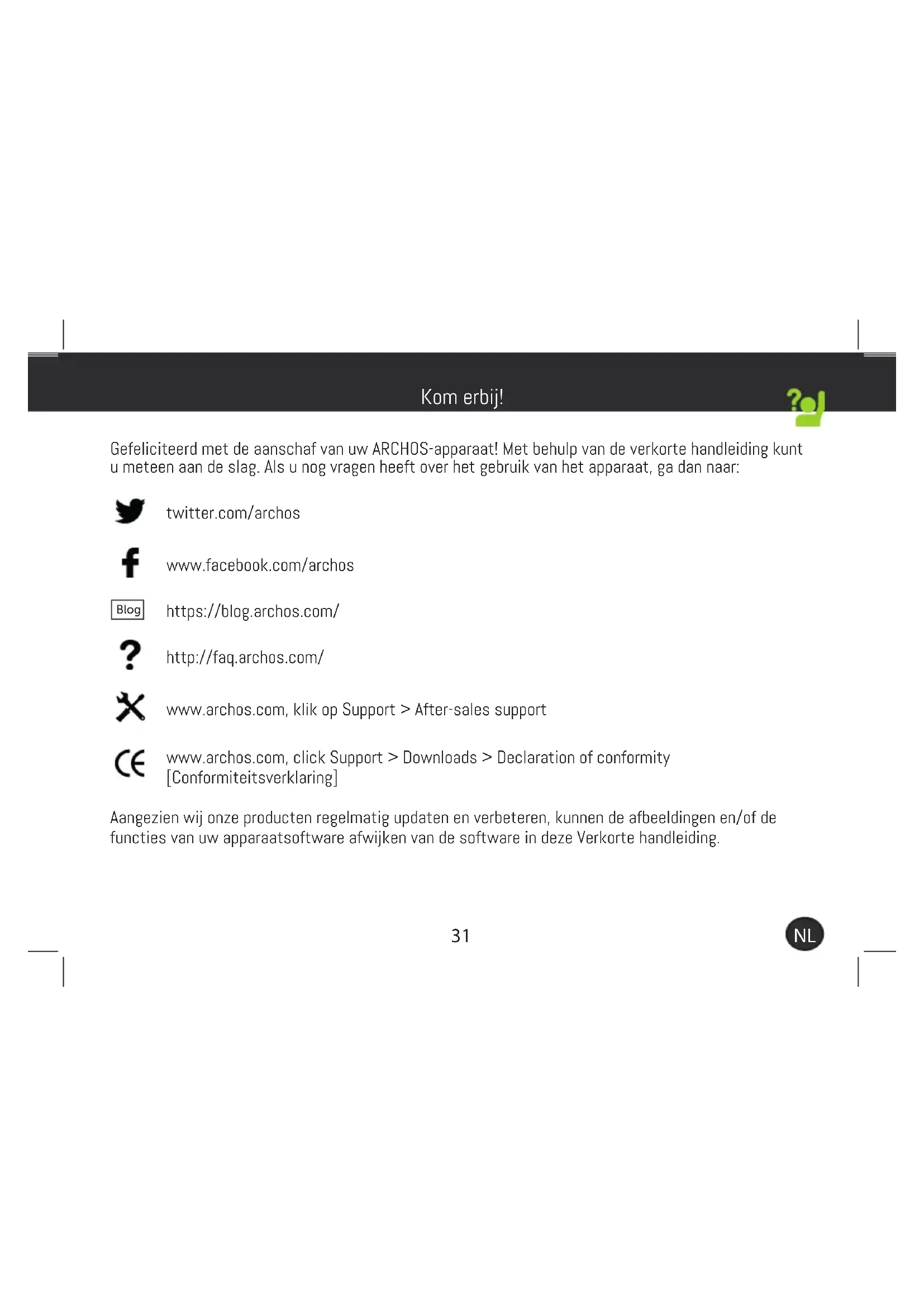 Gefeliciteerd met de aanschaf van uw ARCHOS-apparaat! Met behulp van de verkorte handleiding kunt u meteen aan de slag. Als u nog vragen heeft over het gebruik van het apparaat, ga dan naar: twitter.com/archos www.facebook.com/archos Blog https://blog.archos.com/ http://faq.archos.com/ www.archos.com, klik op Support > After-sales support www.archos.com, click Support > Downloads > Declaration of conformity [Conformiteitsverklaring] Aangezien wij onze producten regelmatig updaten en verbeteren, kunnen de afbeeldingen en/of de functies van uw apparaatsoftware afwijken van de software in deze Verkorte handleiding. Kom erbij!32 Warranty INPUT: 5V 1.5AModel: AC101AS3GV2MADE IN PRCARCHOS SA. 12 rue Ampère 91430 Igny France Access 101