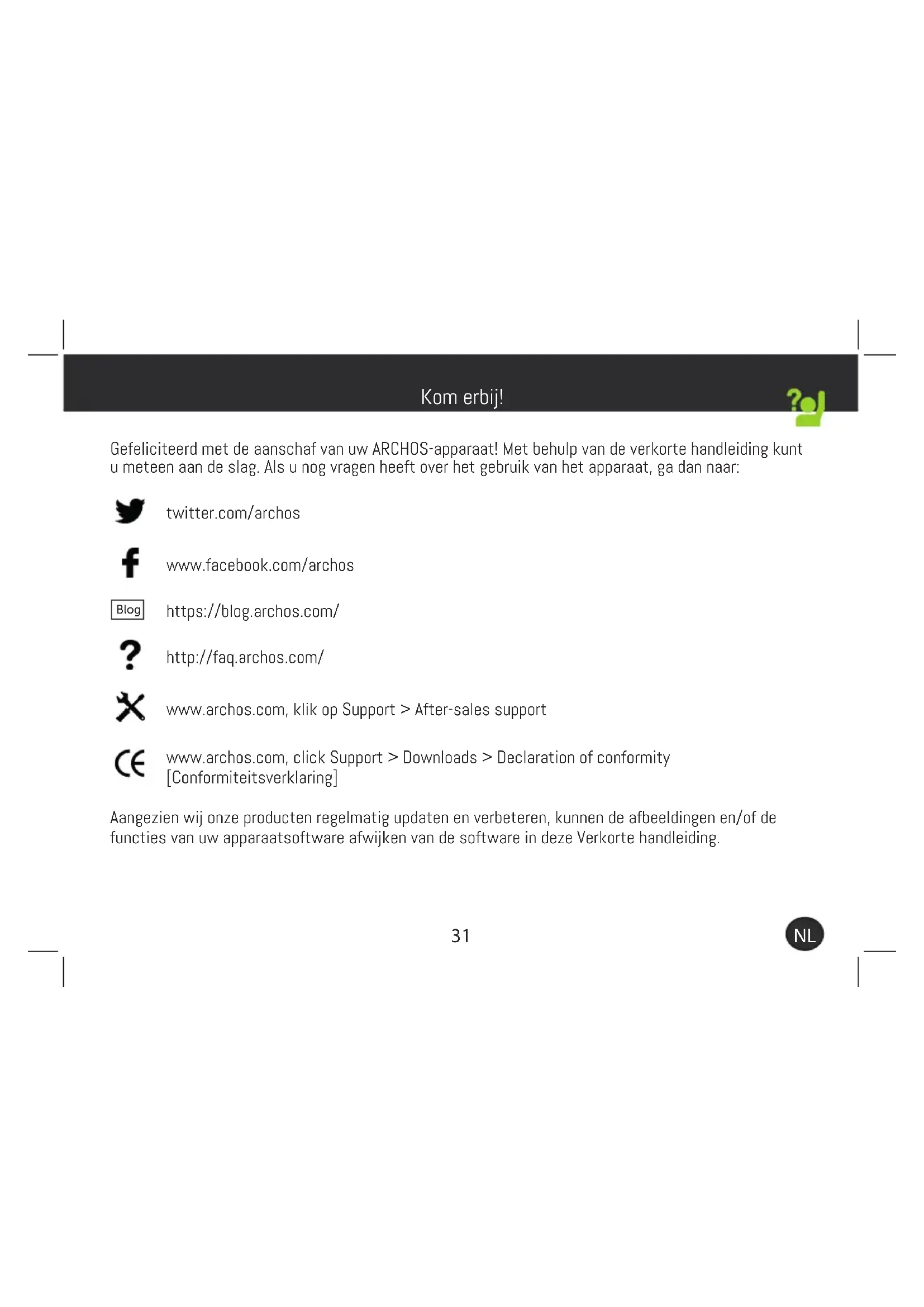 Gefeliciteerd met de aanschaf van uw ARCHOS-apparaat! Met behulp van de verkorte handleiding kunt u meteen aan de slag. Als u nog vragen heeft over het gebruik van het apparaat, ga dan naar: twitter.com/archos www.facebook.com/archos Blog https://blog.archos.com/ http://faq.archos.com/ www.archos.com, klik op Support > After-sales support www.archos.com, click Support > Downloads > Declaration of conformity [Conformiteitsverklaring] Aangezien wij onze producten regelmatig updaten en verbeteren, kunnen de afbeeldingen en/of de functies van uw apparaatsoftware afwijken van de software in deze Verkorte handleiding. Kom erbij!32 Warranty INPUT: 5V 1.5AModel: AC101AS3GV2MADE IN PRCARCHOS SA. 12 rue Ampère 91430 Igny France Access 101
