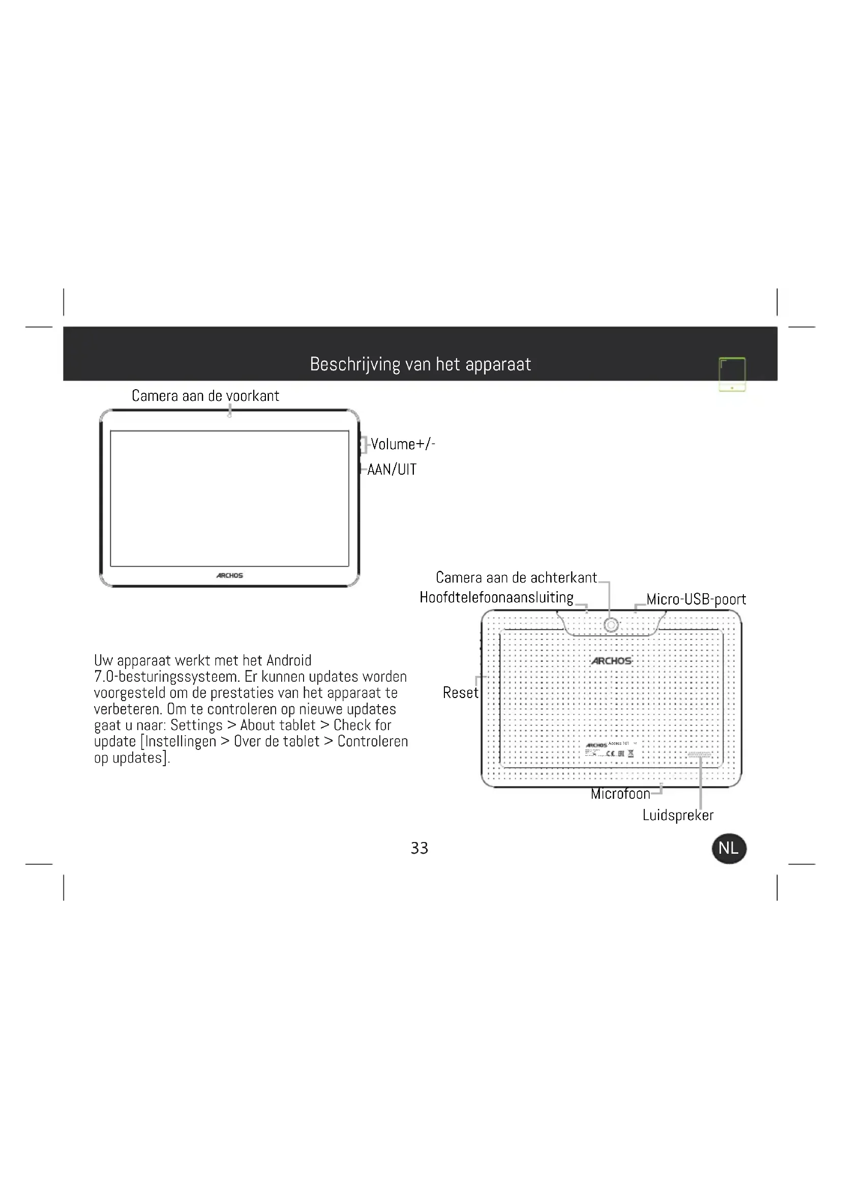 Uw apparaat werkt met het Android 7.0-besturingsystem. Er kuren updates worden voorgesteld om de prestaties van het apparaat te verbeteren. Om te controlleren op neue updates gaat u waar: Settings > About tablet > Check for update [Instellenen > Over de tablet > Controlleren op updates].