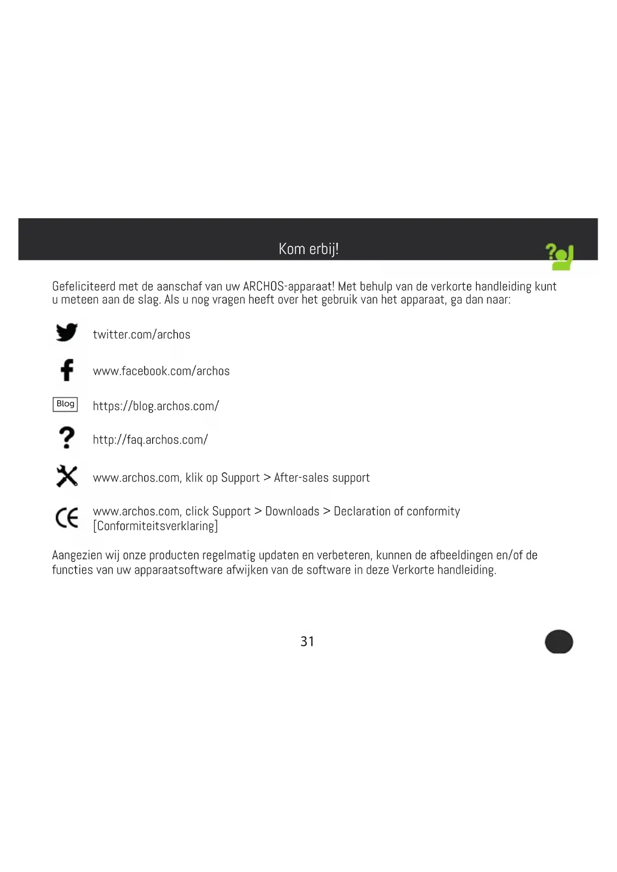 >36NL Probleemoplossing Voor meer antwoorden op technische vragen gaat u naar: faq.archos.com - Wanneer uw apparaat is vastgelopen: Druk 10 seconden lang op de AAN/UIT-knop Of gebruik de reset knop. - Wanneer uw apparaat niet wordt ingeschakeld: