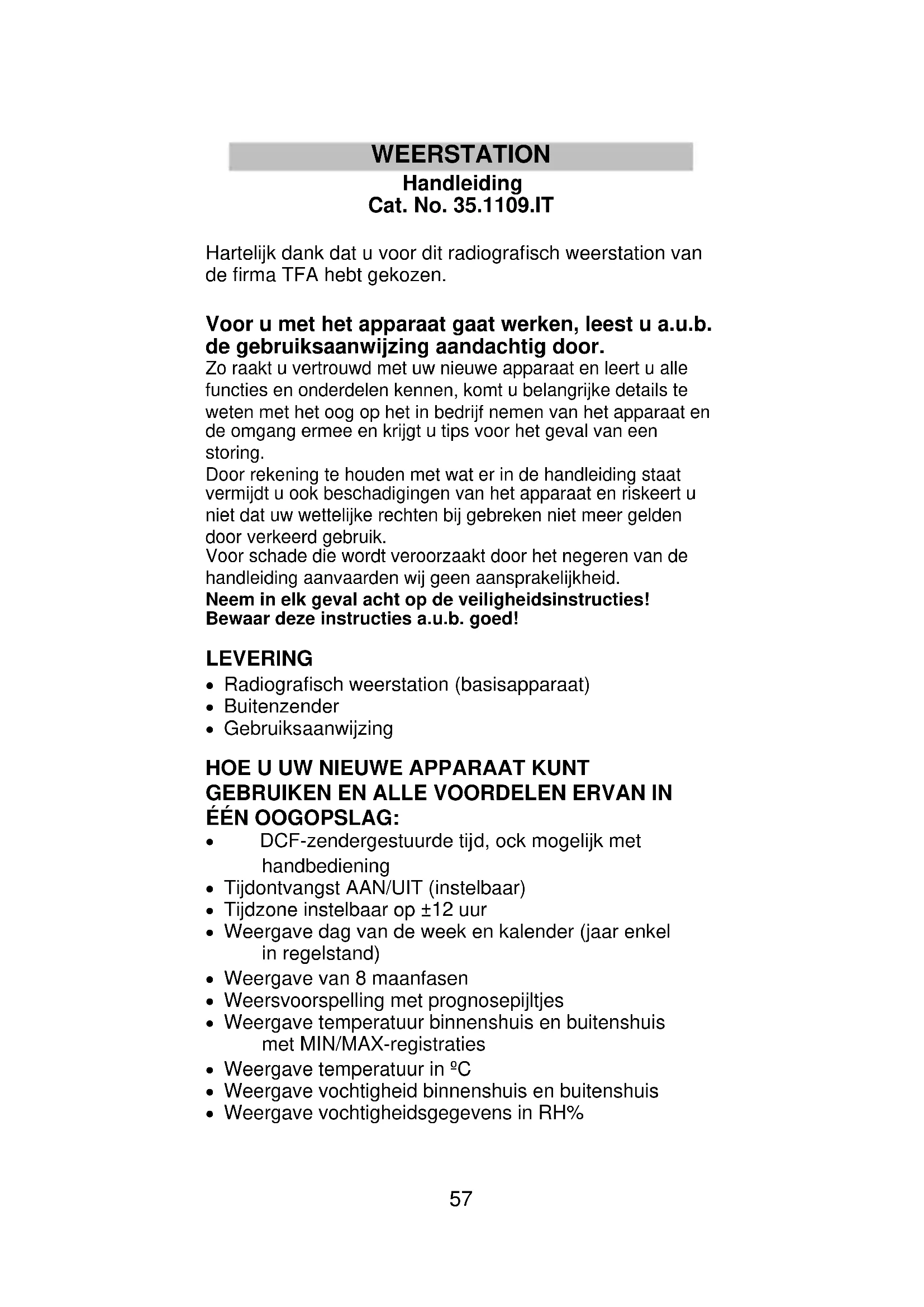 Fréquence de transmission: 868 MHz Puissance de radiofréquence maximale transmise: < 25mW La reproduction, même partielle du présent mode d'emploi est strictement interdite sans l'accord explicite de TFA Dostmann. Les spécifications techniques de ce produit ont été actualisées au moment de l'impression et peuvent être modifiées, sans avis préalable. Les dernières données techniques et des informations concernant votre produit peuvent être trouvées en entrant le numéro de l'article sur notre site. Déclaration UE de conformité Le soussigné, TFA Dostmann, déclare que l'équipement radioélectrique du type 35.1109 est conforme à la directive 2014/53/UE. Le texte complet de la déclaration UE de conformité est disponible à l'adresse internet suivante:56 www.tfa-dostmann.de E-Mail: info@tfa-dostmann.de TFA Dostmann GmbH & Co.KG, Zum Ottersberg 12, D- 97877 Wertheim 10/1657 WEERSTATION Handleiding Cat. No. 35.1109.IT Hartelijk dank dat u voor dit radiografisch weerstation van de firma TFA hebt gekozen. Voor u met het apparaat gaat werken, leest u a.u.b. de gebruiksaanwijzing aandachtig door. Zo raakt u vertrouwd met uw nieuwe apparaat en leert u alle functies en onderdelen kennen, komt u belangrijke details te weten met het oog op het in bedrijf nemen van het apparaat en de omgang ermee en krijgt u tips voor het geval van een storing. Door rekening te houden met wat er in de handleiding staat vermijdt u ook beschadigingen van het apparaat en riskeert u niet dat uw wettelijke rechten bij gebreken niet meer gelden door verkeerd gebruik. Voor schade die wordt veroorzaakt door het negeren van de handleiding aanvaarden wij geen aansprakelijkheid. Neem in elk geval acht op de veiligheidsinstructies! Bewaar deze instructies a.u.b. goed! LEVERING Radiografisch weerstation (basisapparaat) Buitenzender Gebruiksaanwijzing