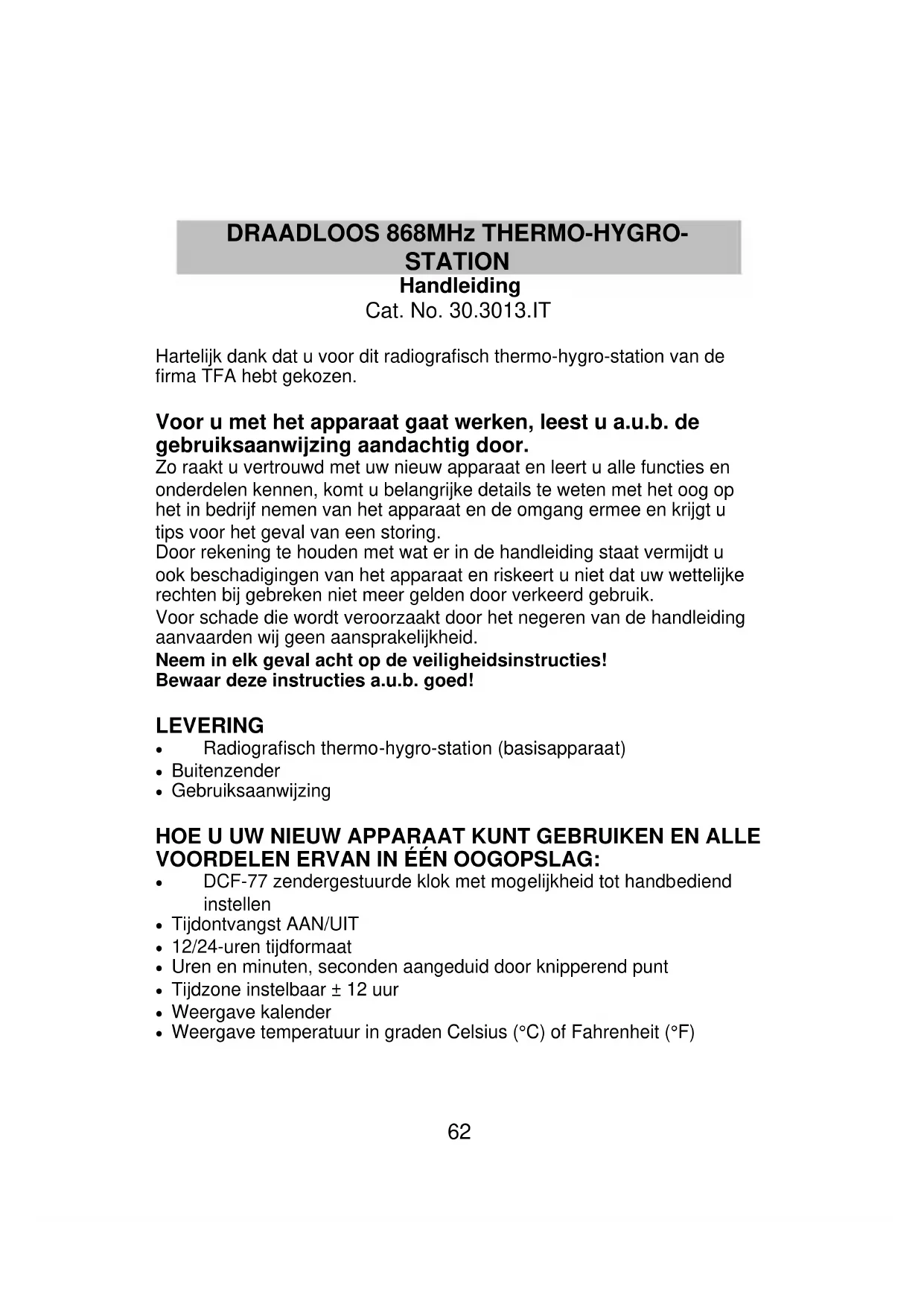 Handleiding Cat. No. 30.3013.IT Hartelijk dank dat u voor dit radiografisch thermo-hygro-station van de firma TFA hebt gekozen. Voor u met het apparaat gaat werken, leest u a.u.b. de gebruiksaanwijzing aandachtig door. Zo raakt u vertrouwd met uw nieuw apparaat en leert u alle functies en onderdelen kennen, komt u belangrijke details te weten met het oog op het in bedrijf nemen van het apparaat en de omgang ermee en krijgt u tips voor het geval van een storing. Door rekening te houden met wat er in de handleiding staat vermijdt u ook beschadigingen van het apparaat en riskeert u niet dat uw wettelijke rechten bij gebreken niet meer gelden door verkeerd gebruik. Voor schade die wordt veroorzaakt door het negeren van de handleiding aanvaarden wij geen aansprakelijkheid. Neem in elk geval acht op de veiligheidsinstructies! Bewaar deze instructies a.u.b. goed! LEVERING Radiografisch thermo-hygro-station (basisapparaat) Buitenzender Gebruiksaanwijzing HOE U UW NIEUW APPARAAT KUNT GEBRUIKEN EN ALLE VOORDELEN ERVAN IN ÉÉN OOGOPSLAG: DCF-77 zendergestuurde klok met mogelijkheid tot handbediend instellen Tijdontvangst AAN/UIT 12/24-uren tijdformaat Uren en minuten, seconden aangeduid door knipperend punt Tijdzone instelbaar ± 12 uur Weergave kalender Weergave temperatuur in graden Celsius (°C) of Fahrenheit (°F)63 Weergave temperatuur binnenshuis en buitenshuis met MIN/MAX- registraties Weergave vochtigheid binnenshuis en buitenshuis als RH% met MIN/MAX-registraties Indicator van behaaglijkheidniveau binnenshuis via vrolijke of bedroefde gezichtjes MIN/MAX registraties voor binnen- en buitentemperatuur met datum en tijdstip van ontvangst; deze kunnen worden gewist Kan ten hoogste 3 buitenzenders ontvangen Indicator lege batterijen Draadloze transmissie via 868 MHz Meetinterval van het signaal ongeveer 4 seconde Voor op tafel of aan de muur VOOR UW VEILIGHEID: Het product is uitsluitend geschikt voor de hierboven beschreven doeleinden. Gebruik het product niet anders dan in deze handleiding is aangegeven. Het eigenmachtig repareren, verbouwen of veranderen van het apparaat is niet toegestaan. Opgelet! Letselgevaar: Bewaar het apparaat en de batterijen buiten de reikwijdte van kinderen. Batterijen niet in het vuur gooien, niet kortsluiten, niet uit elkaar halen of opladen. Kans op explosie! Batterijen bevatten zuren die de gezondheid schaden. Zwakke batterijen moeten zo snel mogelijk worden vervangen om lekkage van de batterijen te voorkomen. Gebruik nooit tegelijkertijd oude en nieuwe batterijen of batterijen van verschillende types. Draag keukenhandschoenen die bestand zijn tegen chemicaliën en een beschermbril wanneer u met uitgelopen batterijen hanteert! Belangrijke informatie over de productveiligheid! Stel het apparaat niet bloot aan extreme temperaturen, trillingen en schokken.64 De buitensensor is tegen spatwater beschermd maar niet waterdicht. Zoek een tegen regen beschermde plaats uit voor de zender. ONDERDELEN: Het thermo-hygro-station