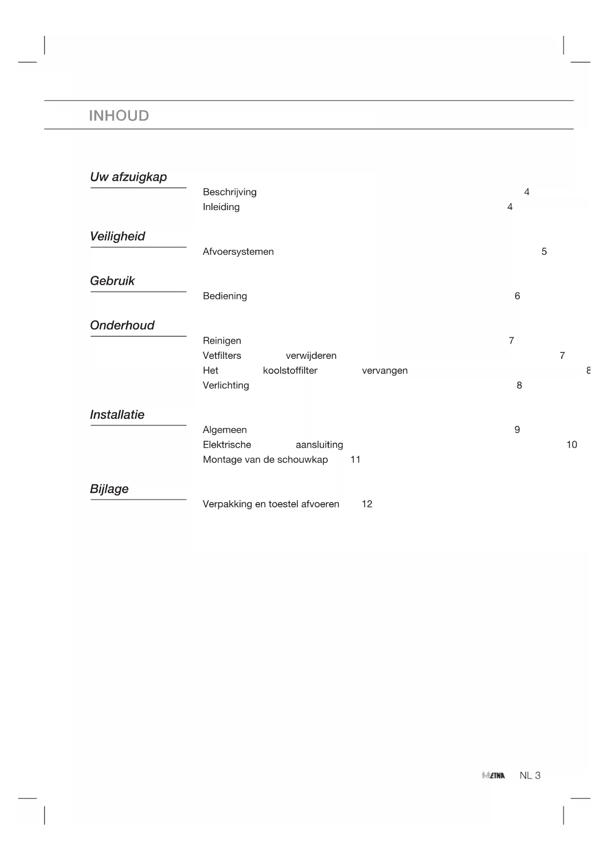 DUNSTABZUGSHAUBE COOKER HOOD AP360ZT AP590ZTNL Gebruiksaanwijzing NL 3 - NL 12 FR Mode d’emploi FR 3 - FR 12 DE Bedienungsanleitung DE 3 - DE 12 EN Instructions for use EN 3 - EN 12 Gebruikte pictogrammen - Pictogrammes utilisés - Benutzte Piktogramme Pictograms used Belangrijk om te weten - Important à savoir - Wissenswertes - Important information Tip - Conseil - TippNL 3 INHOUD Uw afzuigkap Beschrijving 4 Inleiding 4 Veiligheid Afvoersystemen 5 Gebruik Bediening 6 Onderhoud Reinigen 7 Vetfilters verwijderen 7 Het koolstoffilter vervangen 8 Verlichting 8 Installatie Algemeen 9 Elektrische aansluiting 10 Montage van de schouwkap 11 Bijlage Verpakking en toestel afvoeren 12NL 4 Beschrijving