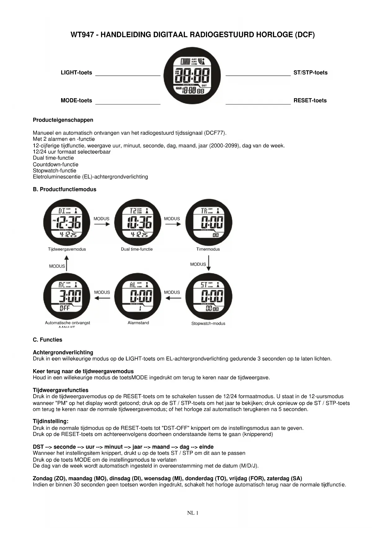 Snoopze: Wanner het alarm afgaat, drukt u op de toets MODE, RESET of ST/STP om het belsignaal te stoppen en automatisch snooze te starten; het alarm za na vijf minuten gedurende 30 seconden afgaan; indien u Niet binnen de 30 seconden op de toets MODE, RESET of ST/STP drukt, za de snooze automatisch stoppen.