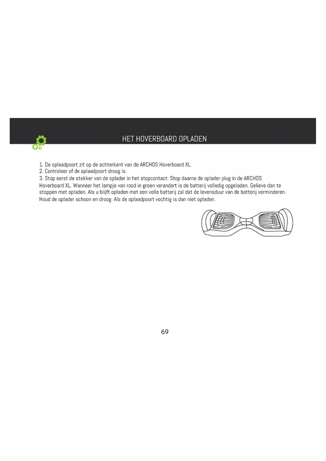 Onderhoud: als de ARCHOS Hoverboard XL goed is opgeladen en de batterij in goede conditie wordt gehouden zal de rij- afstand het meest optimaal zijn. Onjuist opladen en het ontbreken van onderhoud zal de rij-afstand verkleinen.