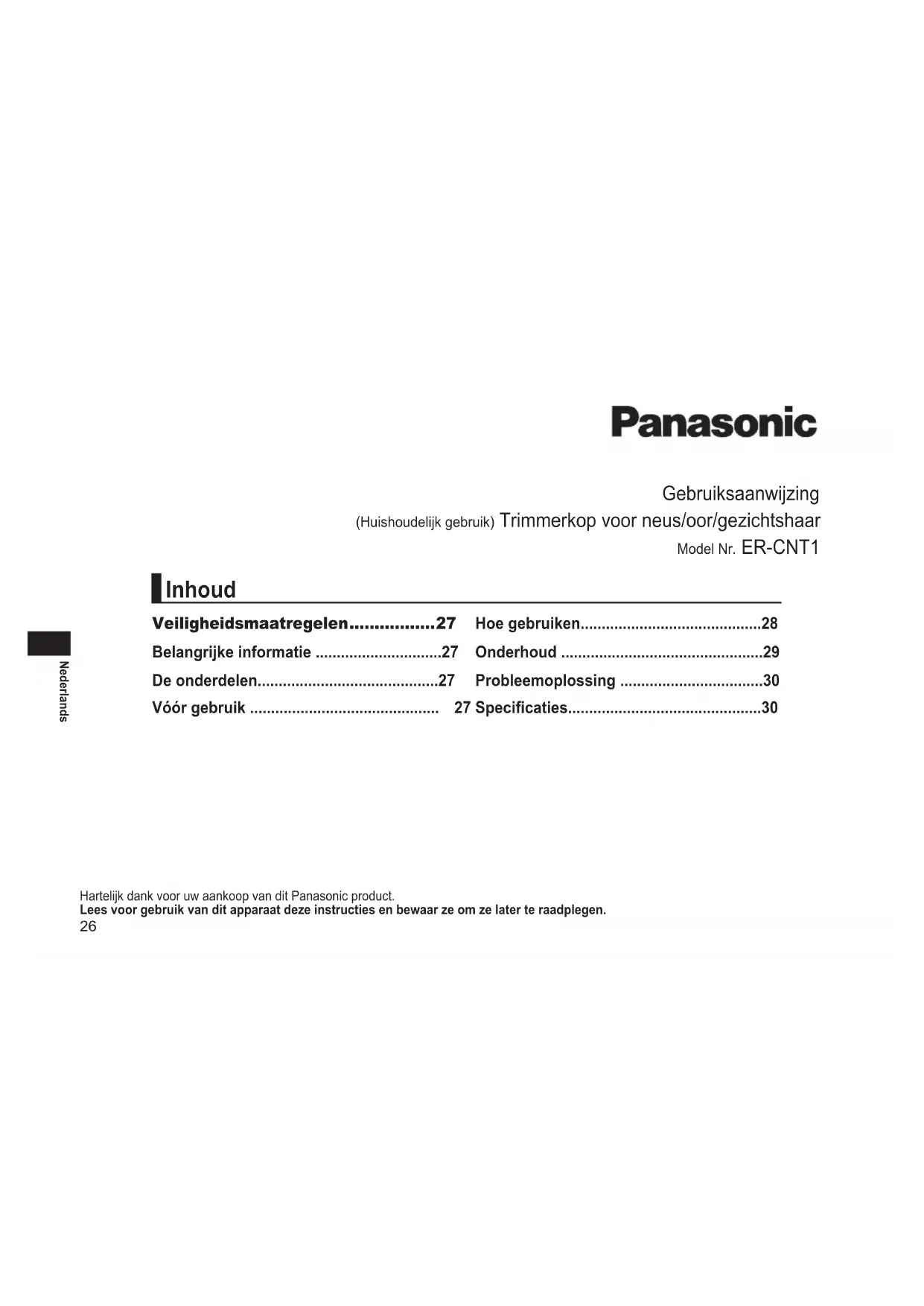 - Binnenmesje Verwijderen Trek aan het binnenmesje om het te verwijderen. Monteren Plaats het binnenmesje recht in het buitenmesje. Probleemoplossing Probleem Actie De knipprestaties lopen terug. Vervang het mesje. Reinig het binnenmesje. Er hangt een vreemde geur. Het mesje beweegt niet/ draait niet soepel. Het zuigvermogen is laag. Reinig de wasringschakelaar. Sluit de waterinlaat. Als de problemen nog steeds niet kunnen worden opgelost, neemt u contact op met uw dealer of met een door Panasonic erkend servicecentrum voor reparatie. Specicaties Door de lucht verspreid akoestisch geluid 62 (dB (A) re 1 pW) Dit product is uitsluitend bestemd voor huishoudelijk gebruik.31 Español Instrucciones de funcionamiento (Uso doméstico) Cabezal de recortador de vello para la nariz/orejas/cara Modelo n.º ER‑CNT1 Gracias por comprar este producto Panasonic. Antesdeponerestaunidadenfuncionamiento,lealasinstruccionesensutotalidadyguárdelasparasuusoenelfuturo. Precauciones de seguridad p. 32