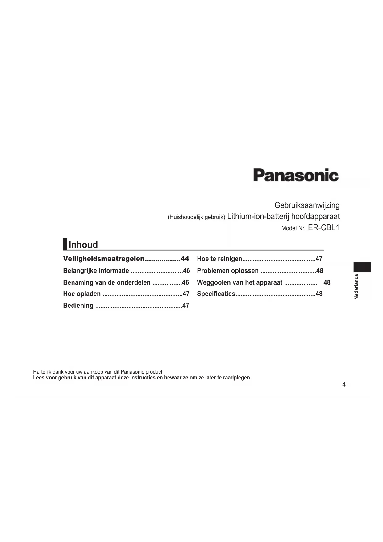 - Dit product is uitsluitend bestemd voor huishoudelijk gebruik.49 Nederlands Voor meer informatie over de energie-efciëntie van het product kunt u op onze website, www.panasonic.com, het modelnummer in het zoekvenster typen. Het ontdoen van oude apparatuur en batterijen Enkel voordeEuropeseUnieenlandenmetrecyclesystemen Deze symbolen op de producten, verpakkingen en/of begeleidende documenten betekenen dat gebruikte elektrische en elektronische producten en batterijen niet samen mogen worden weggegooid met de rest van het huishoudelijk afval. Voor een juiste verwerking, hergebruik en recycling van oude producten en batterijen, gelieve deze in te leveren bij de desbetreffende inleverpunten in overeenstemming met uw nationale wetgeving. Door ze op de juiste wijze weg te gooien, helpt u mee met het besparen van kostbare hulpbronnen en voorkomt u potentiële negatieve effecten op de volksgezondheid en het milieu. Voor meer informatie over inzameling en recycling kunt u contact opnemen met uw plaatselijke gemeente. Afhankelijk van uw nationale wetgeving kunnen er boetes worden opgelegd bij het onjuist weggooien van dit soort afval. Letop:hetbatterijsymbool(Onderstaandsymbool) Dit symbool kan in combinatie met een chemisch symbool gebruikt worden. In dit geval volstaan de eisen, die zijn vastgesteld in de richtlijnen van de desbetreffende chemische stof.50 Español Instrucciones de funcionamiento (Uso doméstico) Unidad principal con batería Li-ion Modelo n.º ER-CBL1 Gracias por comprar este producto Panasonic. Antesdeponerestaunidadenfuncionamiento,lealasinstruccionesensutotalidadyguárdelasparasuusoenelfuturo. Precauciones de seguridad p. 54
