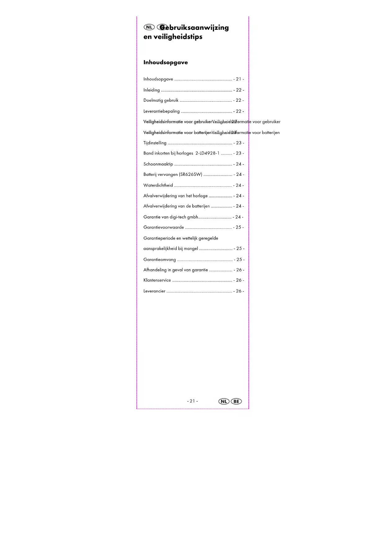 Gebruiksaanwijzing en veiligheidstips Inhoudsopgave Inhoudsopgave .................................................... - 21 - Inleiding ................................................................ - 22 - Doelmatig gebruik ............................................... - 22 - Leverantiebepaling .............................................. - 22 - Veiligheidsinformatie voor gebruiker Veiligheidsinformatie voor gebruikerVeiligheidsinformatie voor gebruiker Veiligheidsinformatie voor gebruiker ............. - 22 - Veiligheidsinformatie voor batterijen Veiligheidsinformatie voor batterijenVeiligheidsinformatie voor batterijen Veiligheidsinformatie voor batterijen ............. - 23 - Tijdinstelling .......................................................... - 23 - Band inkorten bij horloges 2-LD4928-1 .......... - 23 - Schoonmaaktip .................................................... - 24 - Batterij vervangen (SR626SW) .......................... - 24 - Waterdichtheid .................................................... - 24 - Afvalverwijdering van het horloge ..................... - 24 - Afvalverwijdering van de batterijen ................... - 24 - Garantie van digi-tech gmbh.............................. - 24 - Garantievoorwaarde .......................................... - 25 - Garantieperiode en wettelijk geregelde aansprakelijkheid bij mangel .............................. - 25 - Garantieomvang .................................................. - 25 - Afhandeling in geval van garantie ..................... - 26 - Klantenservice ...................................................... - 26 - Leverancier ........................................................... - 26 --