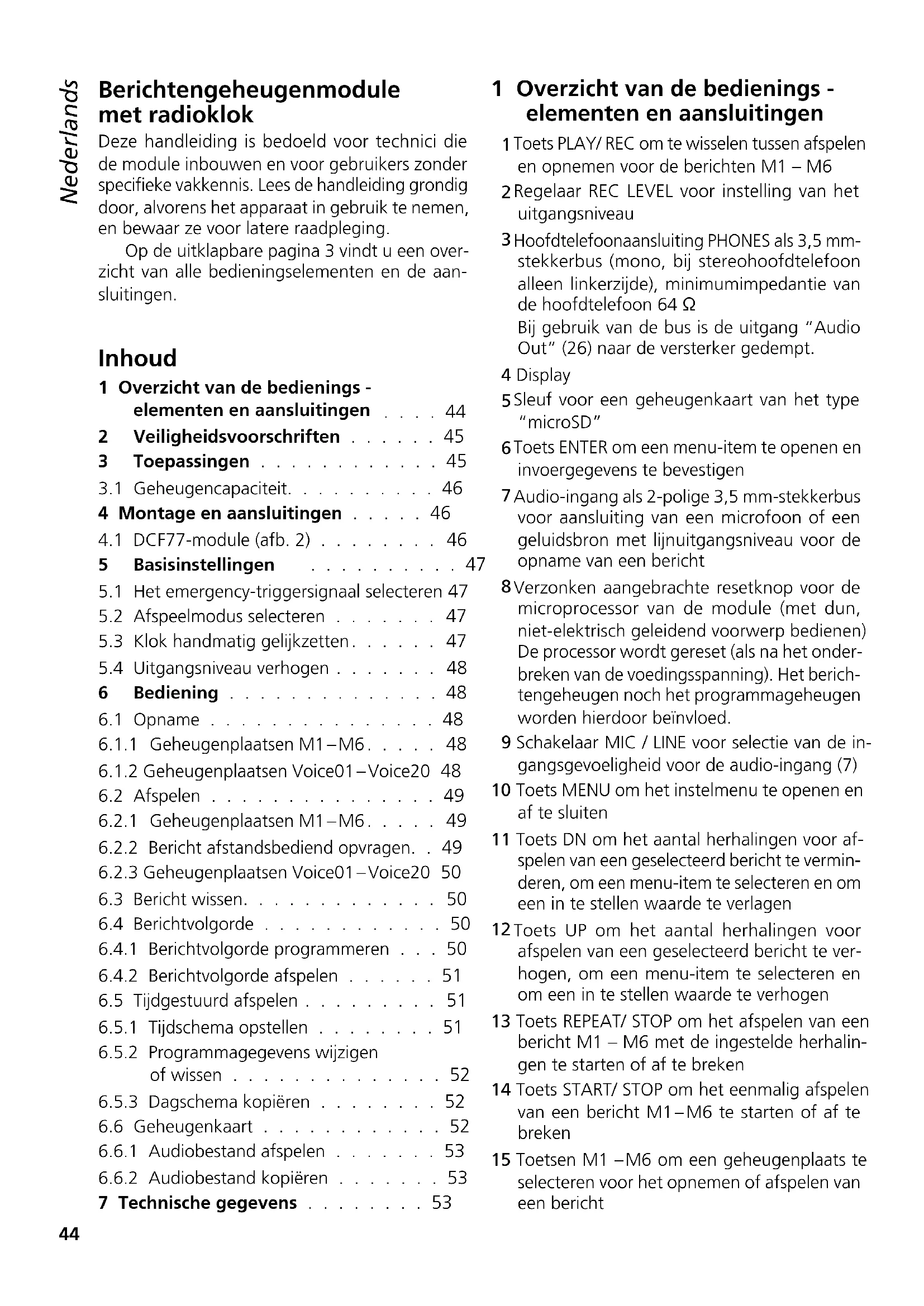 7 Technische gegevens . . . . . . . . 53 Berichtengeheugenmodule metradioklok Deze handleiding is bedoeld voor technici die de module inbouwen en voor gebruikers zonder specifieke vakkennis. Lees de handleiding grondig door, alvorens het apparaat in gebruik te nemen, en bewaar ze voor latere raadpleging. Op de uitklapbare pagina 3 vindt u een over- zicht van alle bedieningselementen en de aan- sluitingen. 1 Overzicht van de bedienings - elementen en aansluitingen