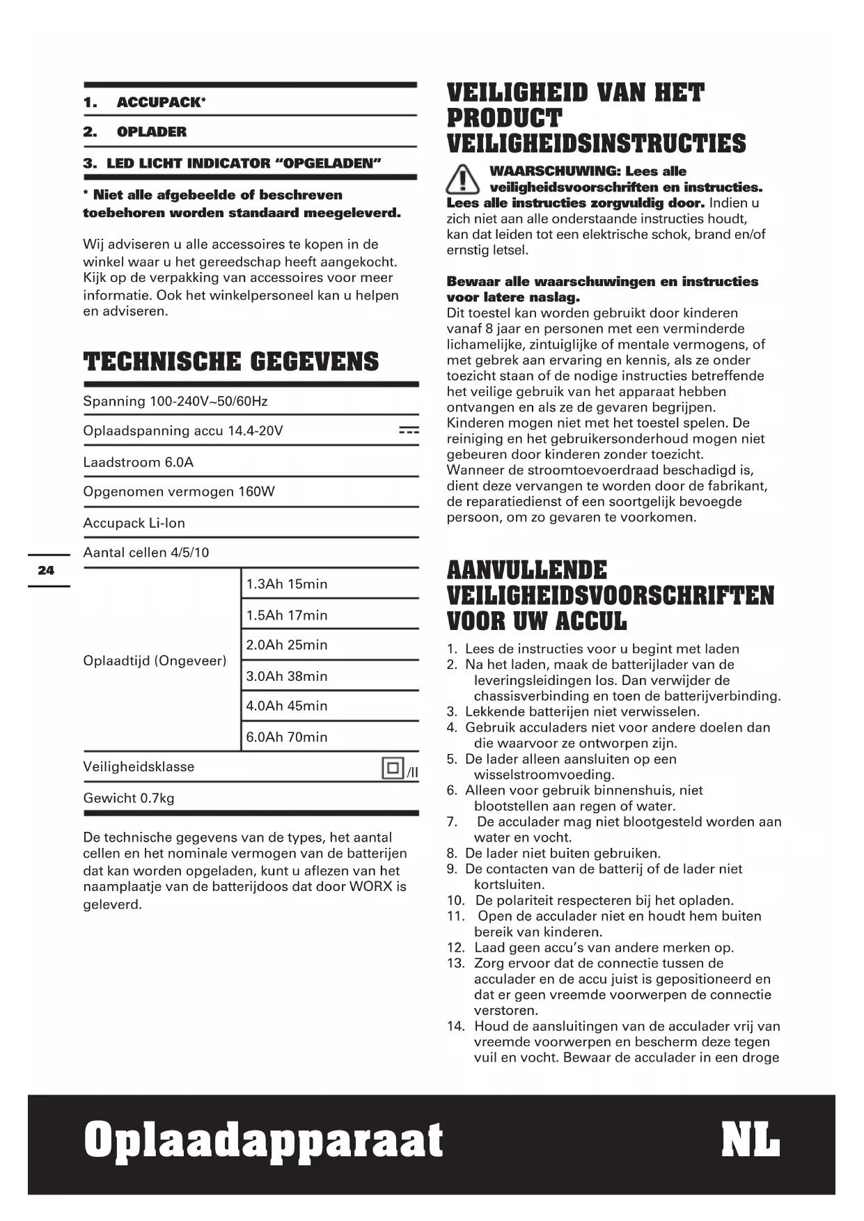 - Niet alle afgebeelde of beschreven toebehoren worden standaard meegeleverd. Wij adviseren u alle accessoires te kopen in de winkel waar u het gereedschap heeft aangekocht. Kijk op de verpakking van accessoires voor meer informatie. Ook het winkelpersoneel kan u helpen en adviseren. TECHNISCHE GEGEVENS Spanning 100-240V~50/60Hz Oplaadspanning accu 14.4-20V Laadstroom 6.0A Opgenomen vermogen 160W Accupack Li-Ion Aantal cellen 4/5/10 Oplaadtijd (Ongeveer) 1.3Ah 15min 1.5Ah 17min 2.0Ah 25min 3.0Ah 38min 4.0Ah 45min 6.0Ah 70min Veiligheidsklasse /II Gewicht 0.7kg De technische gegevens van de types, het aantal cellen en het nominale vermogen van de batterijen dat kan worden opgeladen, kunt u aflezen van het naamplaatje van de batterijdoos dat door WORX is geleverd.